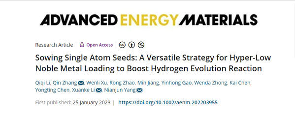 武科大网讯(通讯员吴蔓玲)近日,我校化学与化工学院李轩科教授和张琴副教授团队在《Advanced Energy Materials》期刊上发表题为“Sowing Single Atom Seeds: A Versatile Strategy for Hyper-Low Noble Metal Loading to Boost Hydrogen Evolution Reaction”的研究论文。博士生李琪琪和张琴为第一作者,李轩科、张琴、杨年俊为通讯作者,我校化学与化工学院煤转化重点实验室为论文第一单位。