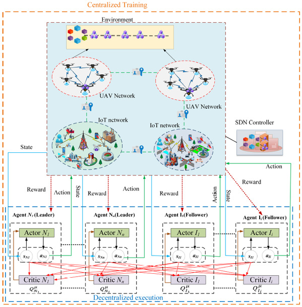 无人机作为空中基站辅助物联网是一项极具前景的技术,可解决诸如扩展网络覆盖、增强网络性能、向物联网设备传输能量、以及在物联网设备上执行计算密集型任务等问题。由于异构的物联网设备有限的处理能力,从而无法长时间执行资源密集型活动。此外,物联网易受安全威胁和自然灾害的影响,限制了其实时应用的执行。尽管已经有许多尝试通过能量收集的计算卸载来解决资源短缺问题,截至目前,对紧急情况和脆弱性问题的研究仍然不足。因此,本文提出了一个基于区块链和多智能体深度强化学习的集成框架,用于在多无人机辅助物联网中使用能量收集进行计算卸载,其中物联网设备从无人机获取计算和能量源。首先,将优化问题表述为计算卸载和能量收集问题的联合优化问题,同时考虑到最优资源价格。其次,将优化问题建模为Stackelberg博弈,通过允许物联网设备和无人机不断调整其资源需求和定价策略来研究它们之间的交互。特别地。所定义的形式化问题可以通过随机博弈模型间接解决,可最小化物联网设备的计算成本,同时最大化无人机的效用。相应的,设计了一个基于多智能体深度强化学习的算法,采用了集中训练和分散执行策略,利用算法自身动态性和高维特性,解决了所定义的问题,并通过广泛的实验结果进一步证明了所提出的框架的优越性。