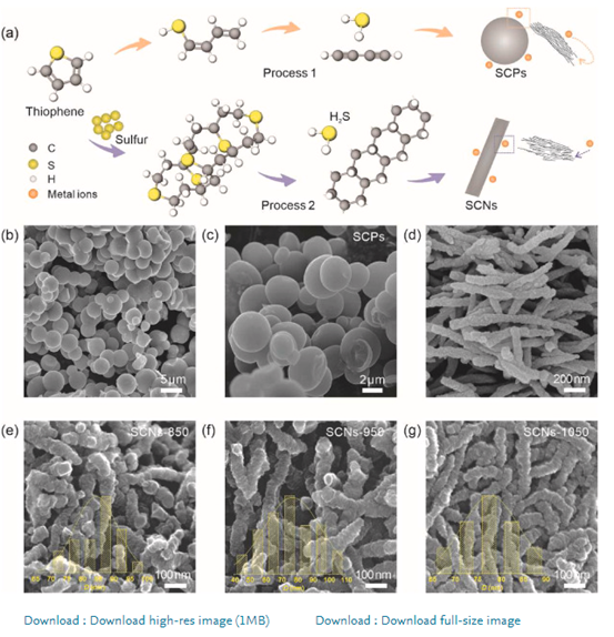 总之,通过在充满硫蒸汽的气氛下聚合噻吩来制造具有沿轴垂直排列的高取向碳层的S掺杂碳纳米棒。SCN 为 Na/K 离子提供了丰富的活性边缘平面位点和短扩散路径,从而增强了电容行为。此外,S掺杂引起的大层间距离和合理的吸附能降低了离子扩散势垒,从而在插层过程中提供了快速的反应动力学。独特的结构使SCNs在不同电流密度下对SIBs和PIBs都具有大而稳定的比容量以及高倍率容量和循环耐久性。因此,改善碳阳极动力学的结构设计概念是有效且具有前瞻性的。