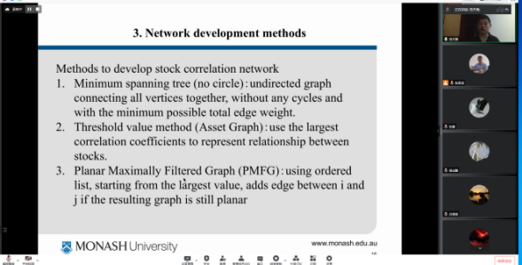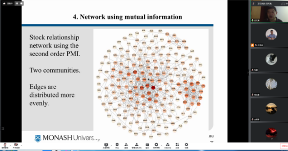 武科大网讯(通讯员张婷婷 周俊爽)6月10日晚七点,澳大利亚莫纳什大学田天海教授应邀,于线上平台向理学院师生题为“Stock Networks Using Mutual Information Theory”的学术报告。报告会由我校理学院副院长陈贵词教授主持,六十余名师生参加了此次报告会。