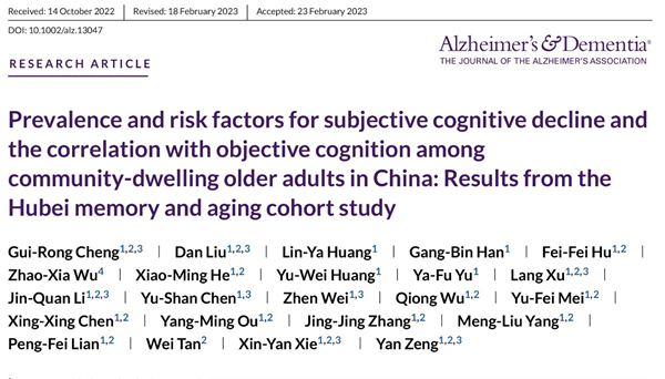 该研究成果于4月26日发表在《Alzheimer's & Dementia(阿尔茨海默病及痴呆)》(最新影响因子:16.655)杂志上。本研究表明,SCD可能是临床前AD的敏感和非侵入性预测因子,可以用作社区认知筛查。我校程桂荣、刘丹、黄琳雅和韩刚斌为本研究的共同第一作者,曾燕为本研究的通讯作者。