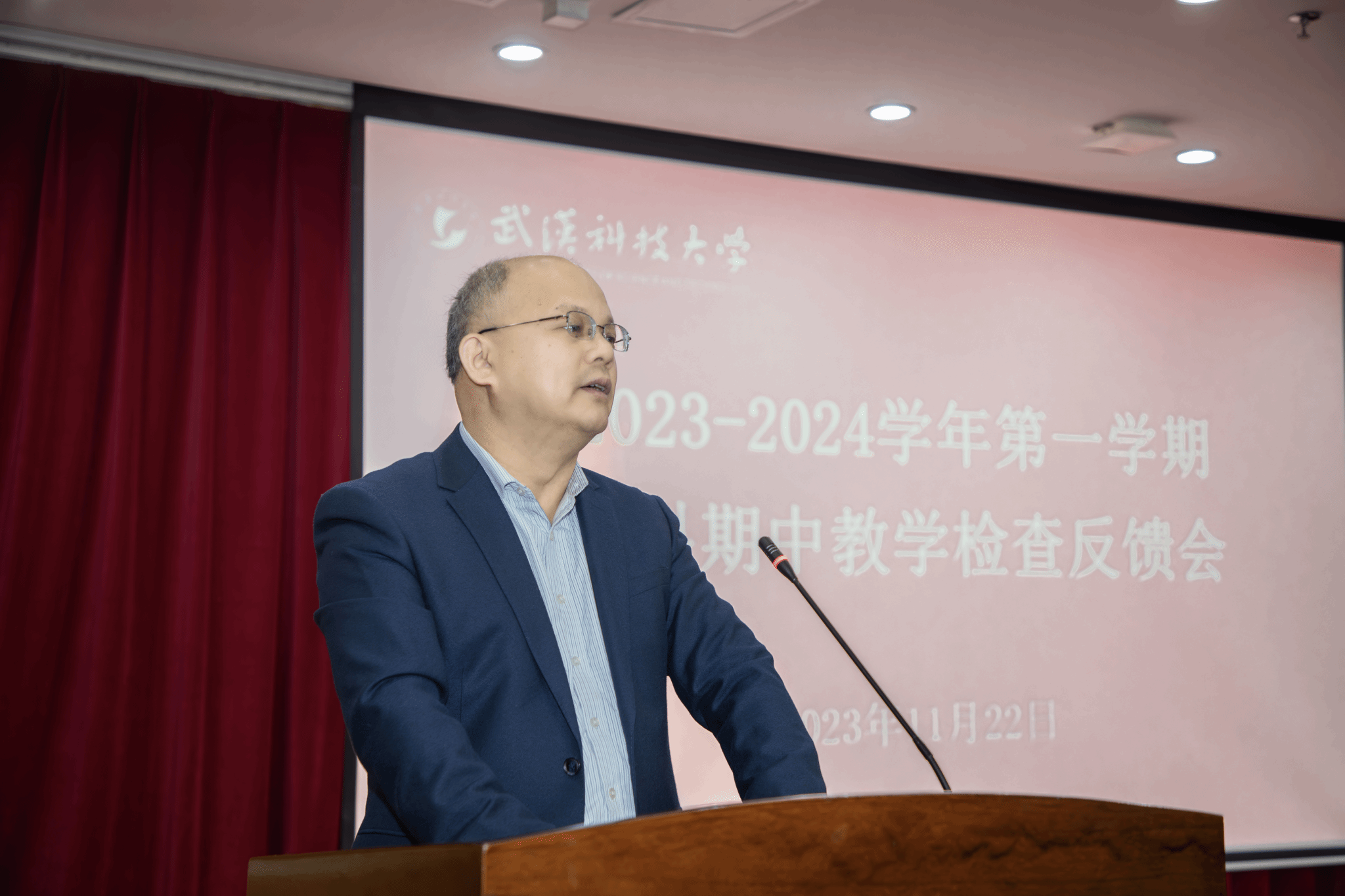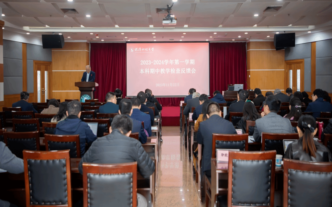 武科大网讯(通讯员曾琦 李理 摄影陈孖川)11月22日上午,学校2023-2024学年第一学期本科期中教学检查反馈会在青山校区主楼18楼报告厅召开。校长倪红卫出席会议。本科生院执行院长丁宇主持会议。