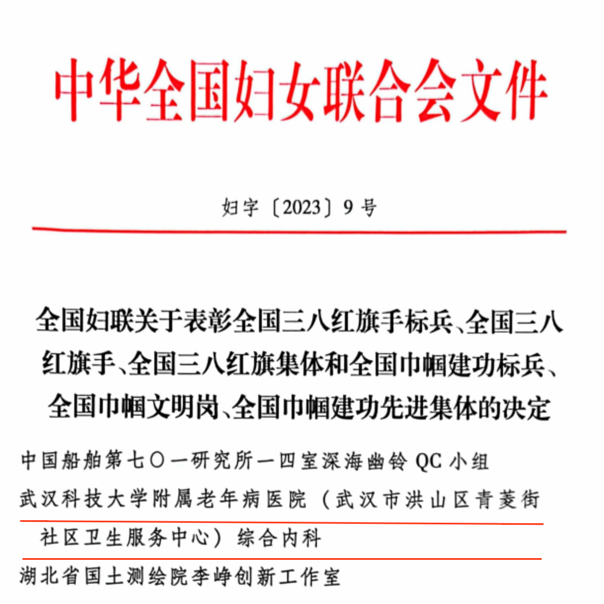 武科大网讯 近日,中华全国妇女联合会下发全国妇联关于表彰全国三八红旗手标兵、全国三八红旗手、全国三八红旗集体和全国巾帼建功标兵、全国巾帼文明岗、全国巾帼建功先进集体的决定,我校附属老年病医院(武汉市洪山区青菱街社区卫生服务中心)综合内科被授予“全国巾帼文明岗”荣誉称号。