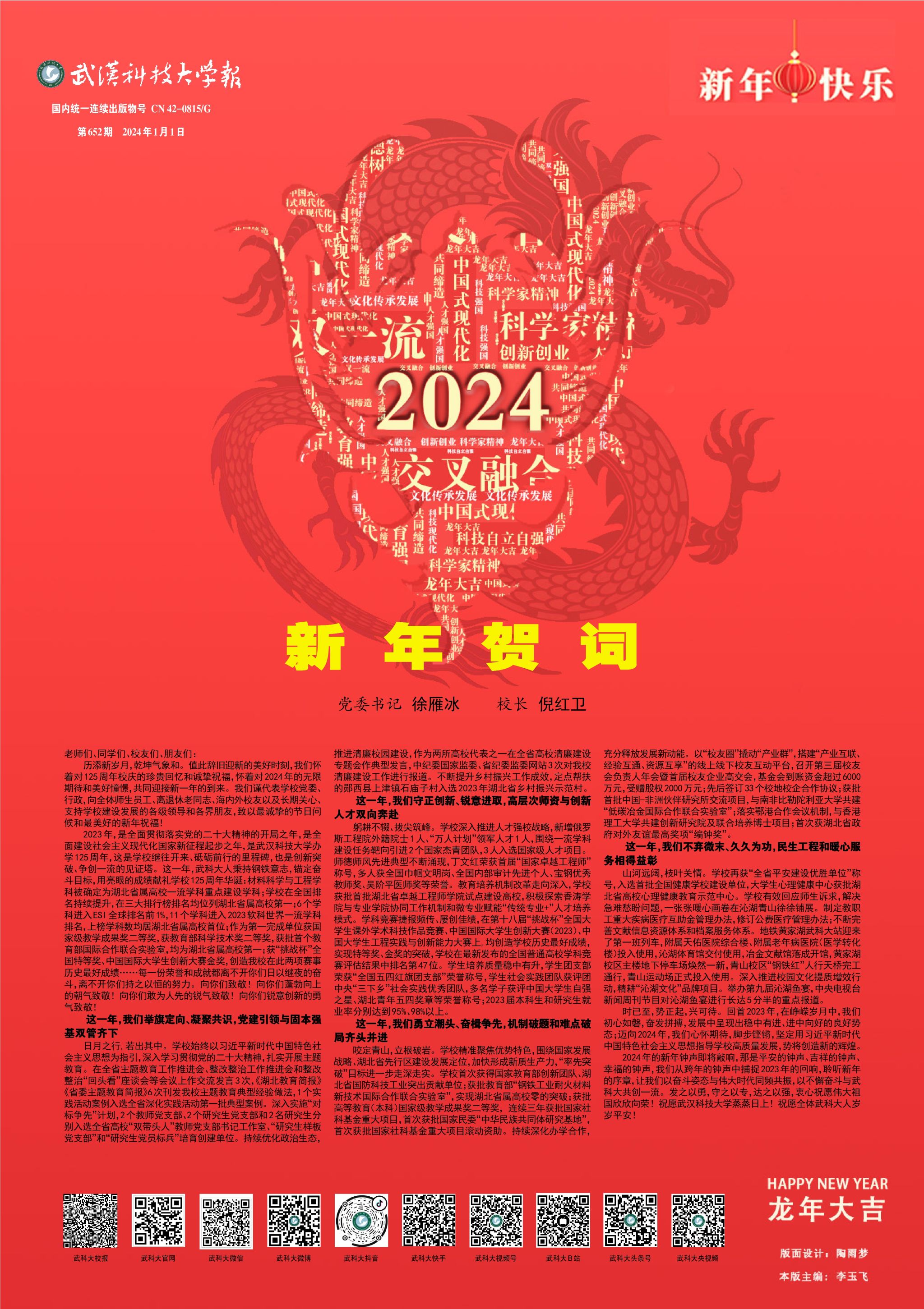 历添新岁月,乾坤气象和。值此辞旧迎新的美好时刻,我们怀着对125周年校庆的珍贵回忆和诚挚祝福,怀着对2024年的无限期待和美好憧憬,共同迎接新一年的到来。我们谨代表学校党委、行政,向全体师生员工、离退休老同志、海内外校友以及长期关心、支持学校建设发展的各级领导和各界朋友,致以最诚挚的节日问候和最美好的新年祝福!