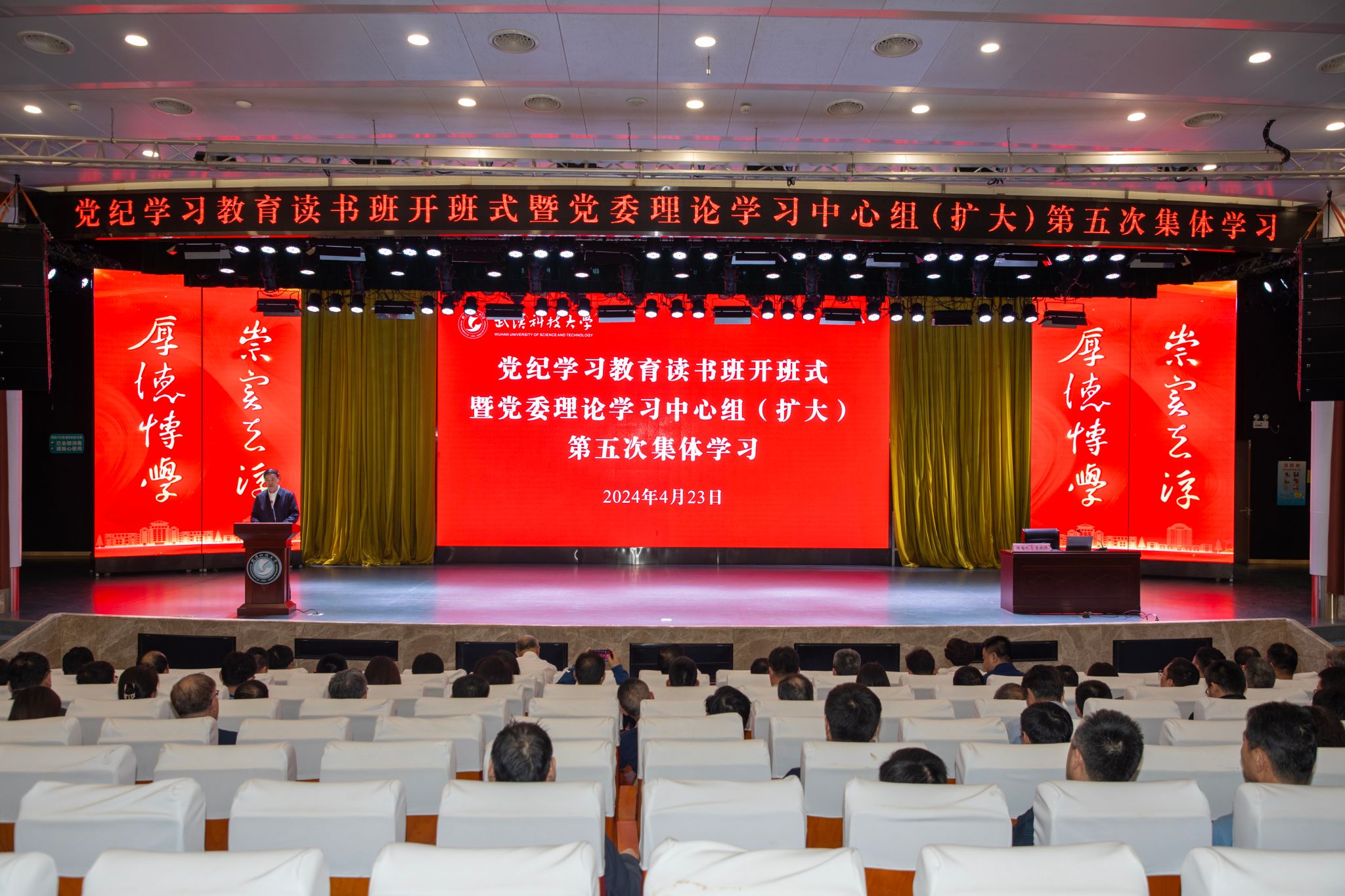 徐雁冰强调,全校各级党组织和广大党员干部要深刻认识开展党纪学习教育的重大意义,将党纪学习教育作为一项重要政治任务,自觉同以习近平同志为核心的党中央保持高度一致,统一思想、统一行动,做到知行知止、令行禁止;要准确把握党纪学习教育的目标任务,把学习重点聚焦到《中国共产党纪律处分条例》上来,原原本本、逐章逐条学,深刻把握学纪是基础,知纪是前提,明纪是关键,守纪是根本,做到学深学透、入脑入心,切实将党纪落实在实际行动上、体现在具体工作中;要坚决扛牢主体责任,高质量高标准完成各项任务,努力实现党纪学习教育的成果转化,围绕中心、服务大局,进一步营造良好的校园政治生态,提振干事创业激情,切实把学习成果转化为推动学校高质量发展的实绩,为加快建成中部地区崛起重要战略支点、奋力推进中国式现代化湖北实践作出武科大贡献。