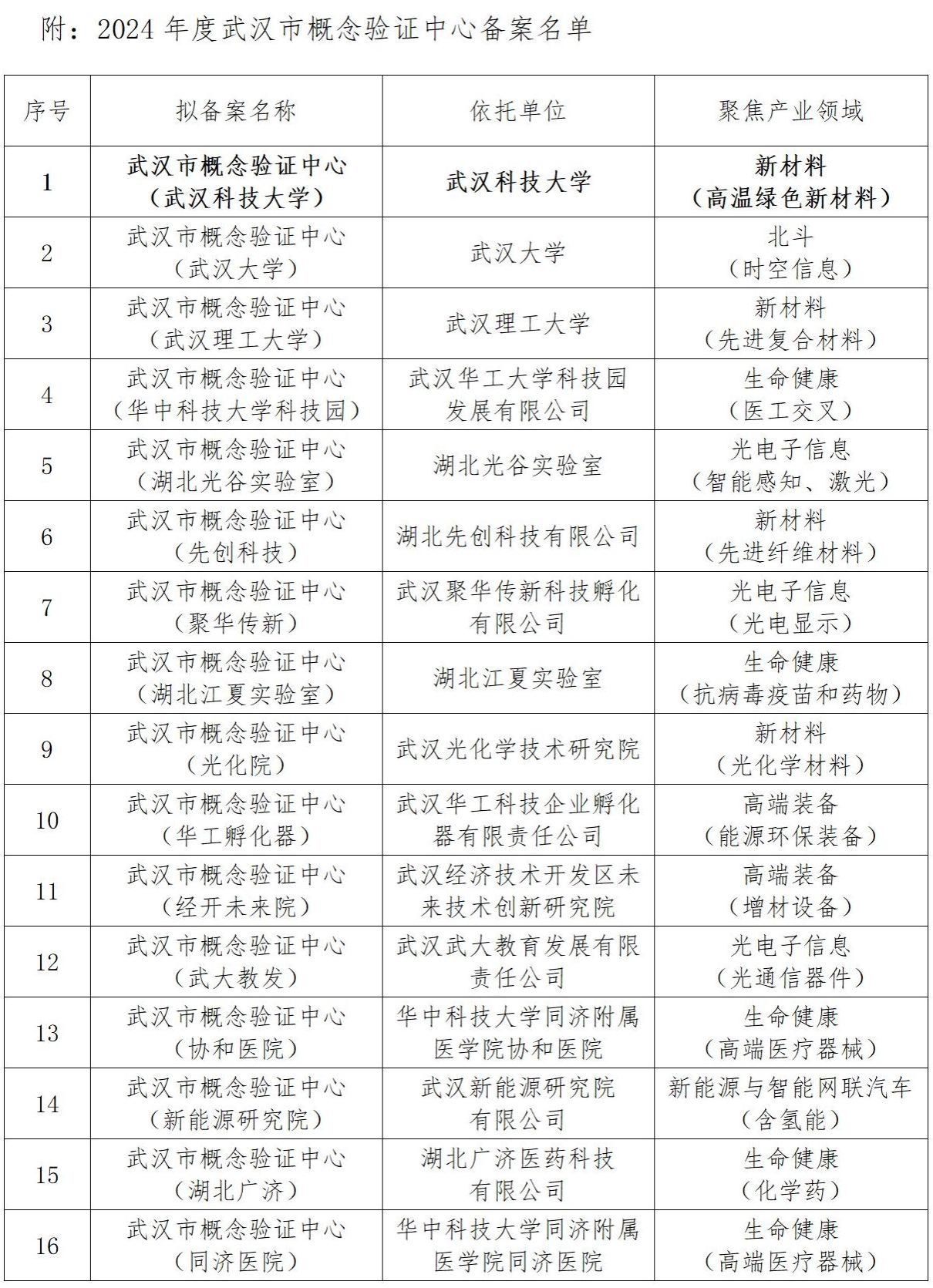 本次为武汉市首次申报,高校、科研院所、新型研发机构、医疗卫生机构和社会龙头企业同台竞技。评选采取备案制,即鼓励申报单位“先建后验”,突出考核验证工作实效。经单位申报、区科技管理部门审核推荐和市科技创新局形式审查、专家评审、实地核查、集体决策和网上公示等程序,最终确定入选16家。