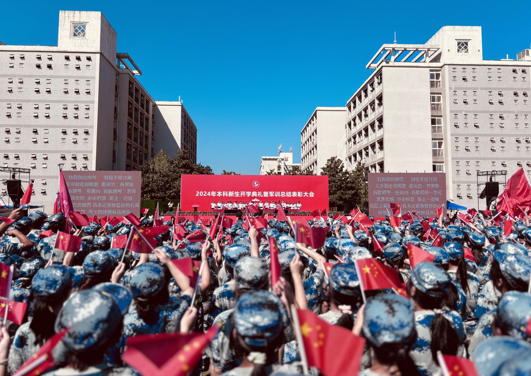 6200 余名本科新生身着迷彩服参加此次活动。大会在庄严雄壮的国歌旋律中拉开序幕。摆字方阵迅速调换红、黄纸板,依次摆出 “WUST”“1949”“中国” 等字样,擒敌拳方阵的拳术动作整齐划一,应急棍方阵接踵而至,匕首操方阵在响亮的 “杀” 声中精彩完成表演,武术表演和战场战术表演结束后赢得了场上阵阵掌声。各学院新生身着迷彩服,高举旗帜,喊着嘹亮的口号,迈着整齐的步伐从主席台前走过。