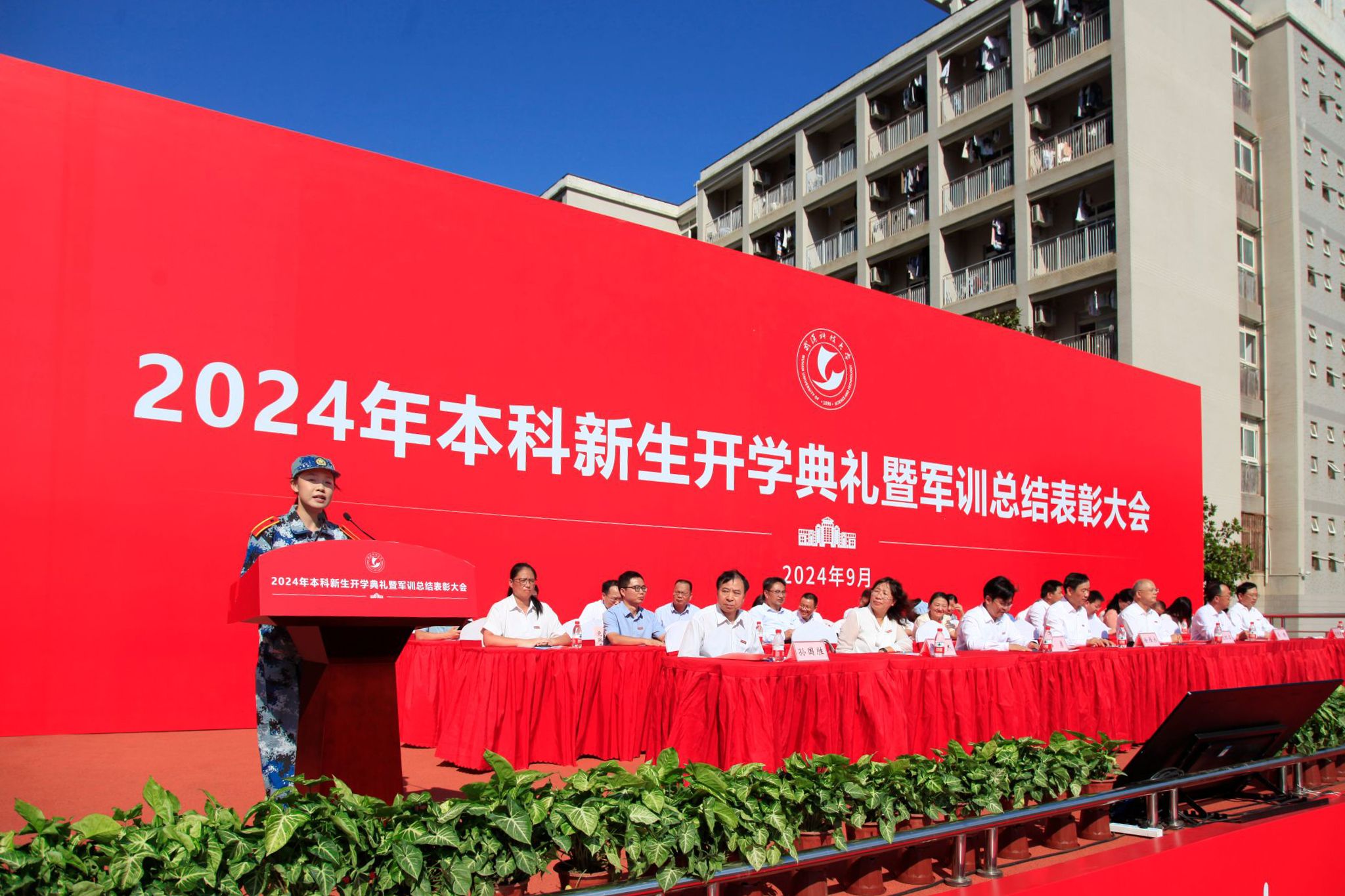武科大网讯(通讯员刘喆 程秦晴)9月29日上午,2024年本科新生开学典礼暨军训总结表彰大会在我校黄家湖校区南园操场隆重举行。校党委书记徐雁冰,校长倪红卫,党委副书记孙国胜,副校长吕勇、马腾、董丽杰,党委常委刘时新,空军预警学院大队长张力以及学校各职能部门、各学院领导出席本次大会。孙国胜主持大会。