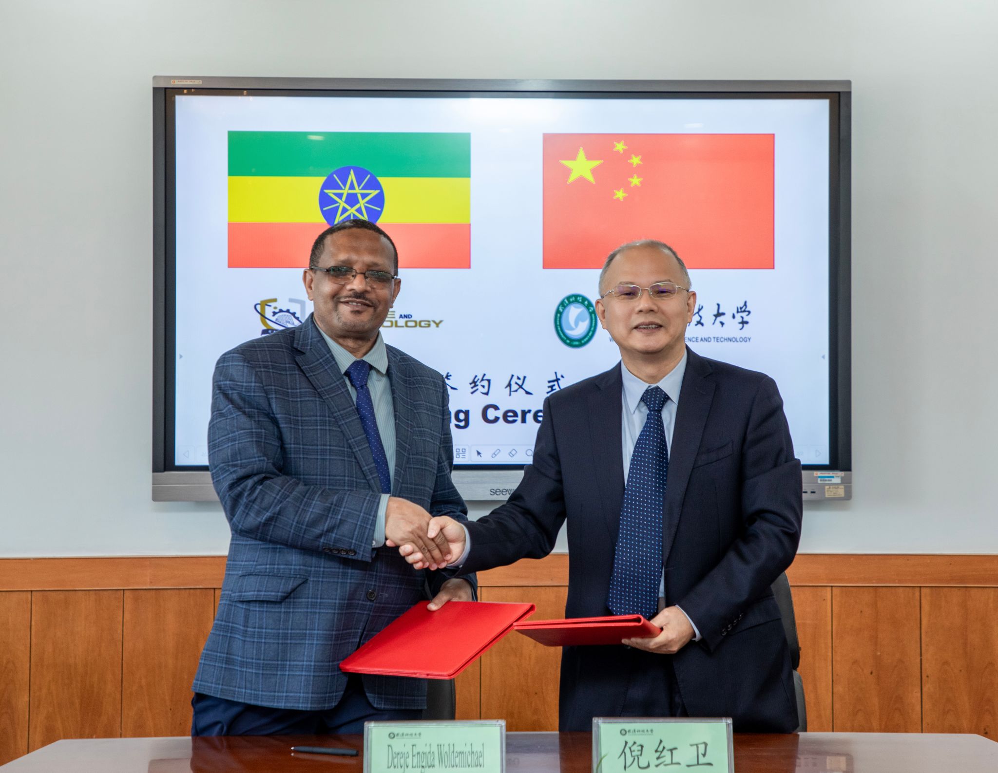 倪红卫对Dereje Engida Woldemichael一行的到来表示热烈欢迎。他表示学校非常重视与非洲的合作。武科大不仅是“中非创新合作中心”网络协作单位,也是中非青年创新创业示范基地。希望两校通过面对面沟通,加强在教师互访、学生交流等方面的合作,为进一步推进联合实验室和技术转化中心的建设创造条件。