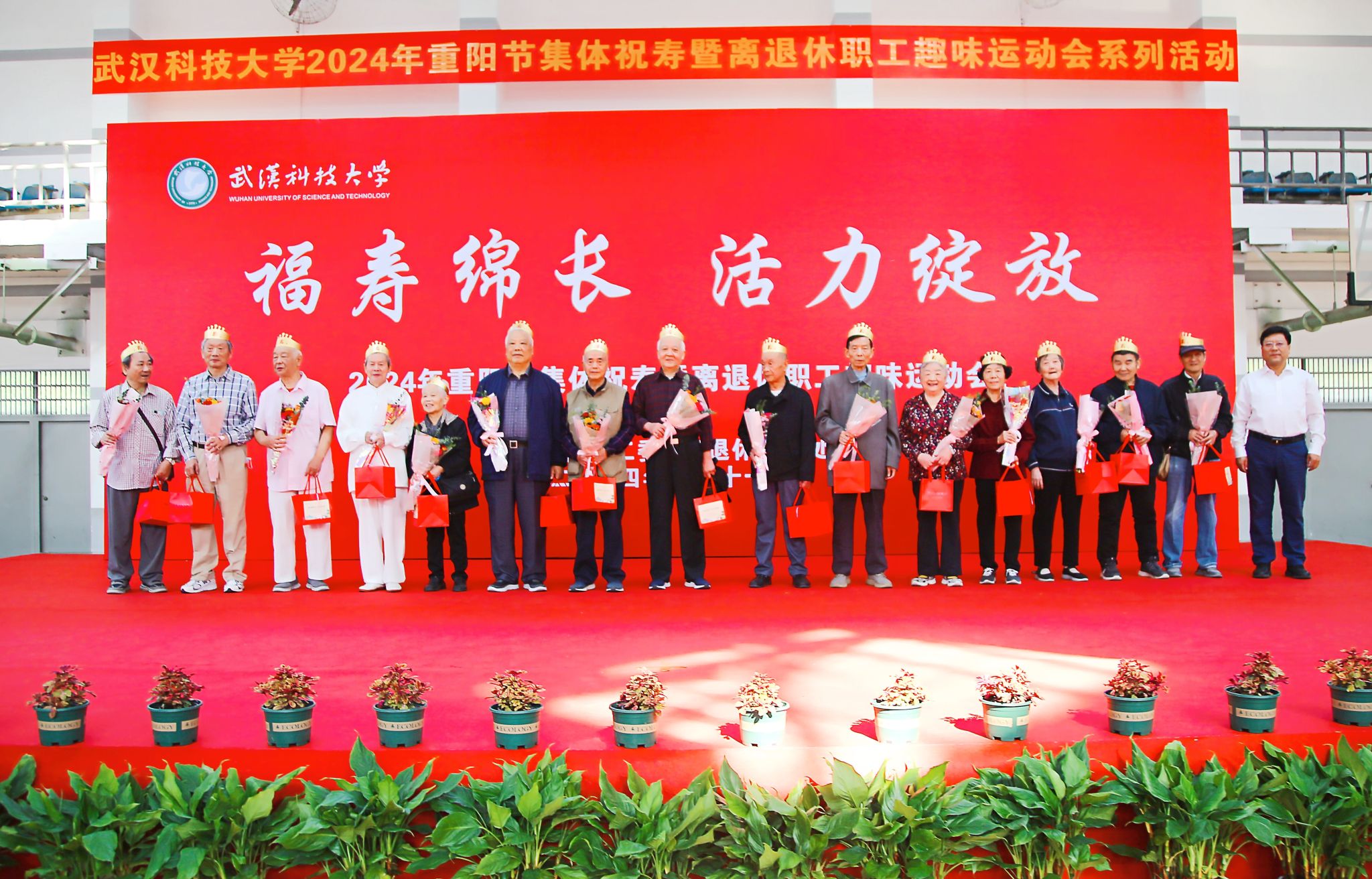 武科大网讯(记者李芳) 10月11日上午,又逢一年一度的重阳佳节。2024年“福寿绵长 活力绽放”集体祝寿暨离退休职工趣味运动会在我校青山校区东院体育馆举行。校党委书记徐雁冰,党委常委、副校长沈季伟,党委常委、组织部部长刘时新同现场90、80、70周岁寿星,老党员、老教师等代表,以及有关职能部门负责人欢聚一堂,共庆佳节。
