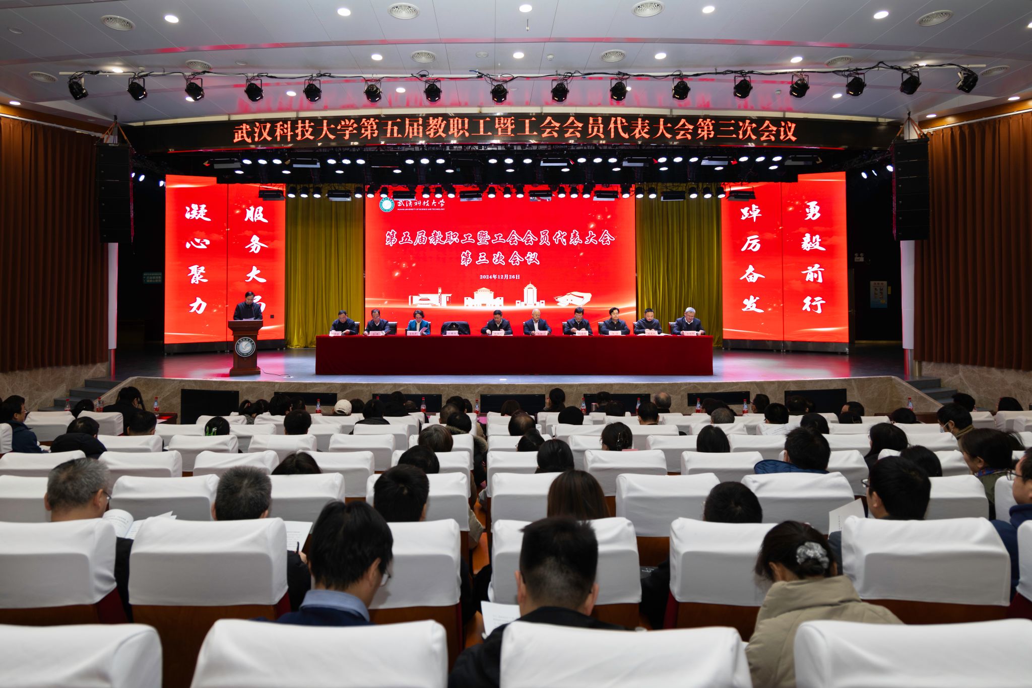 武科大网讯 12月26日上午,学校第五届教职工暨工会会员代表大会第三次会议在青山校区碧园会堂召开。全体校领导,两百余名教代会工代会代表、列席代表围绕深入学习宣传贯彻党的二十届三中全会和习近平总书记考察湖北重要讲话精神,抢抓国家“双一流”建设扩围历史机遇,共商学校高质量发展大计。