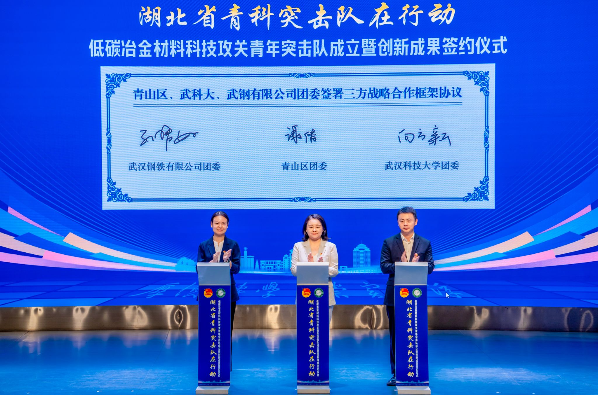 武科大网讯 4月27日下午,学校在青山校区碧园会堂举办湖北省青科突击队在行动——低碳冶金材料科技攻关青年突击队成立暨创新成果签约仪式。共青团湖北省委书记刘治田,武汉市青山区委副书记、区委政法委书记彭勇军,团武汉市委副书记吴海东,宝钢股份党委常委、副总经理,武钢有限公司党委书记、执行董事彭俊,中钢洛耐总经理、武汉耐材公司党委书记、执行董事、总裁左锐,校党委书记徐雁冰出席活动。校党委副书记孙国胜主持。