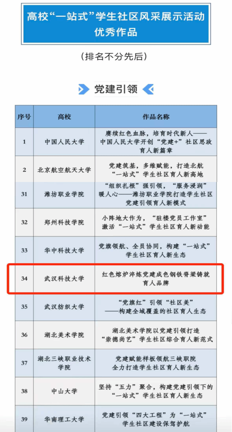 武科大网讯 近日,教育部思想政治工作司公布2025年高校“一站式”学生社区风采展示活动优秀成果评选结果,我校报送的《红色熔炉淬炼党建成色 钢铁脊梁铸就育人品牌》入选“党建引领”类别优秀成果。这是我校首次荣获该类别荣誉,标志着学校“一站式”学生社区建设取得突破性进展。