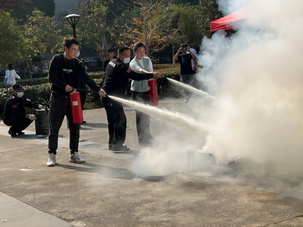 在消防科老师们的指导和保护下,现场围观的同学们纷纷上场亲身学习体验如何使用灭火器材扑灭初起火情。