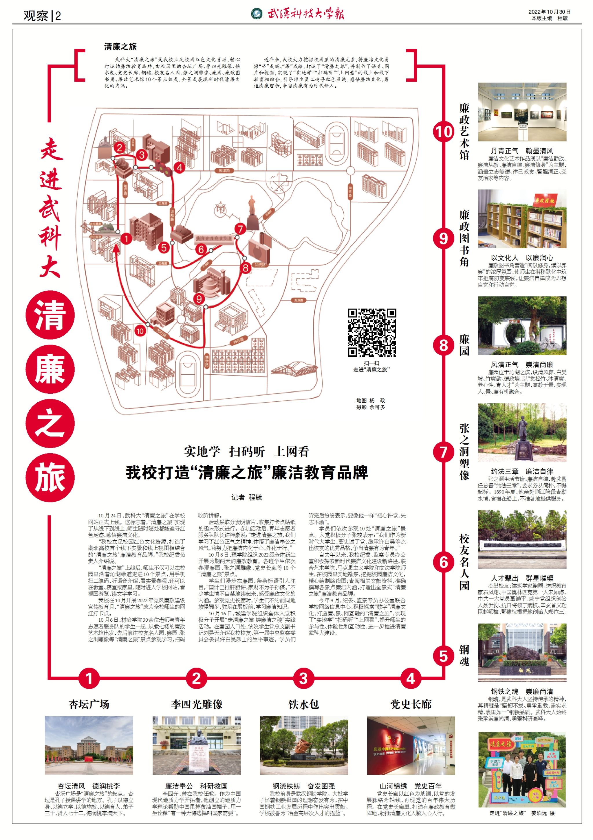 今年9月,纪委、监察专员办公室联合学校网络信息中心,积极探索“数字”清廉文化,打造廉、景、网互融的“清廉之旅”,实现了“实地学”“扫码听”“上网看”,提升师生的参与性、体验性和互动性,进一步推进清廉武科大建设。