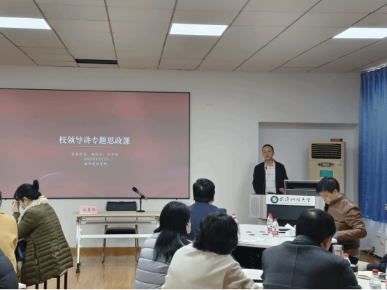 武科大网讯 为全面学习领会习近平新时代中国特色社会主义思想,深入学习贯彻党的二十大精神,不断增进师生对党的创新理论的政治认同、思想认同、理论认同、情感认同。12月7日下午,党委常委、副校长沈季伟在黄家湖校区教五楼51208报告厅为城建学院师生讲授专题思政课。