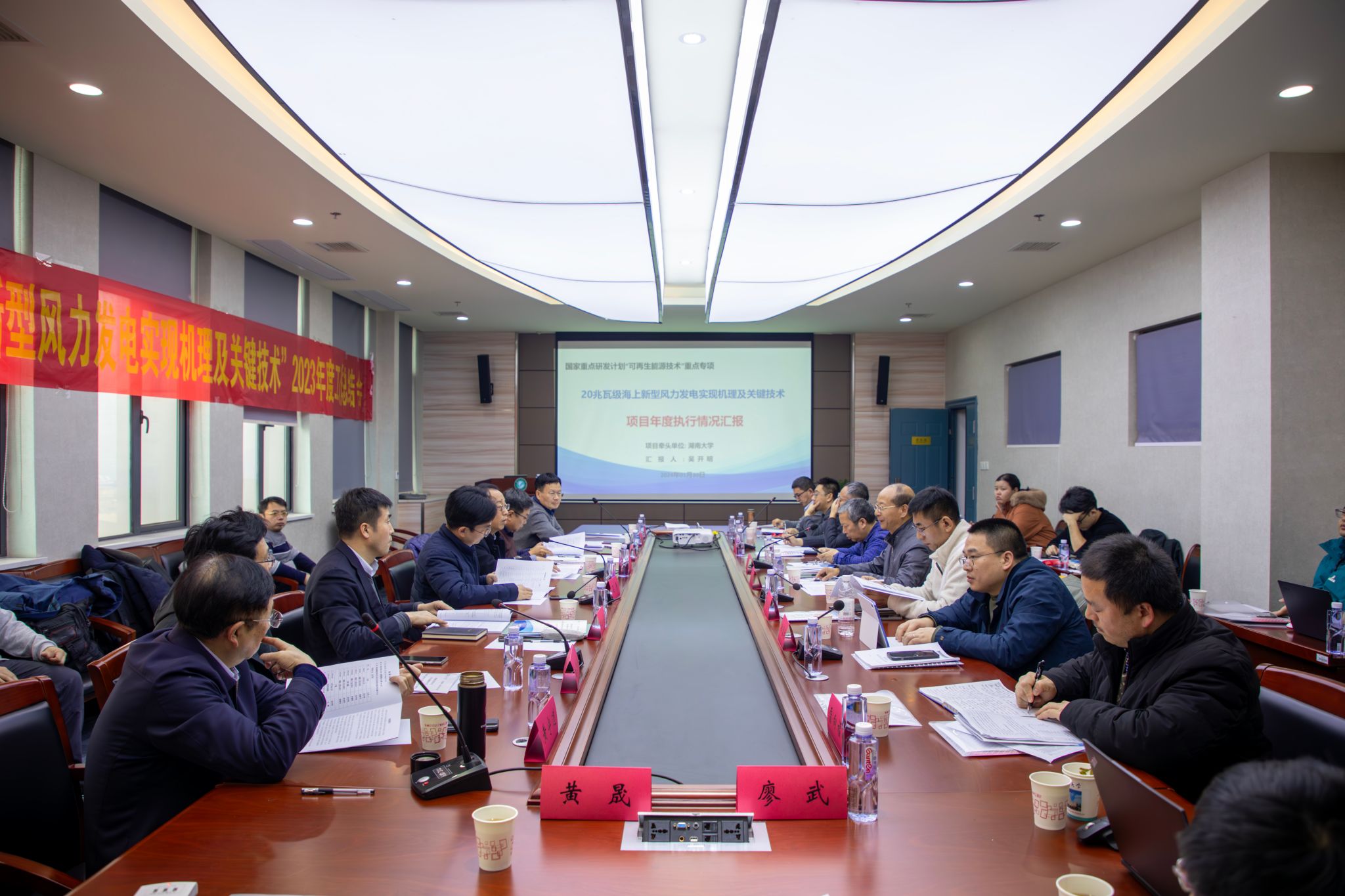 吴开明、山东中能华源海上风电集团有限公司技术总监徐新华、湖南大学罗德荣教授、华北电力大学林忠伟教授、哈电风能有限公司总经理助理阳雪兵分别就自己所负责的课题作专题汇报。