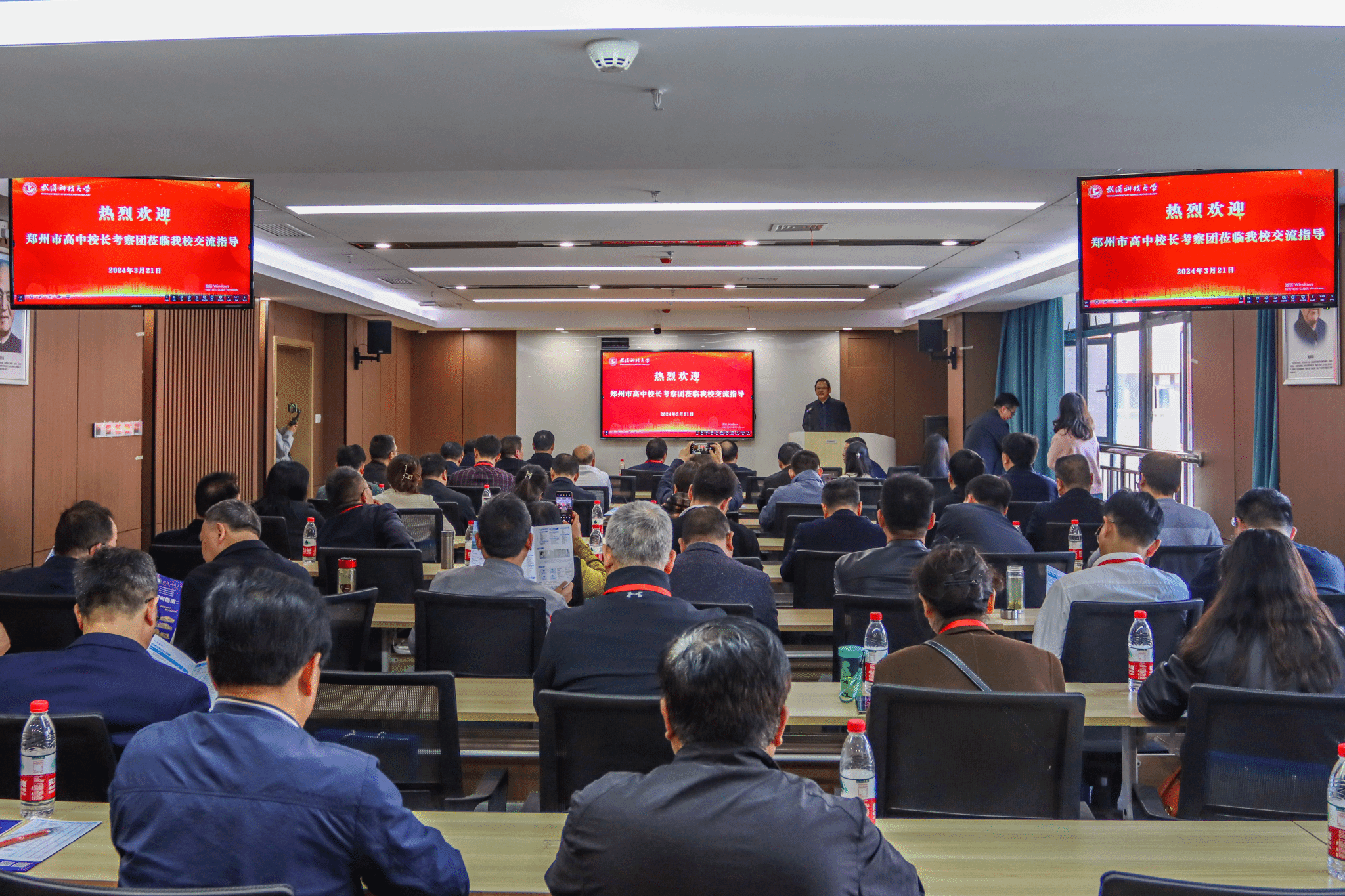 武科大网讯(通讯员童畅 赵梦霄 王钰然 摄影杨曜恺)3月21日,郑州市招生考试中心主任秦天育、副主任张戈、郑州市高中校长考察团一行莅临我校黄家湖校区进行交流考察。我校党委副书记孙国胜、本科生院执行院长丁宇、本科招生办公室主任朱明等陪同考察交流。交流会在黄家湖校区教十一楼举行,丁宇主持。