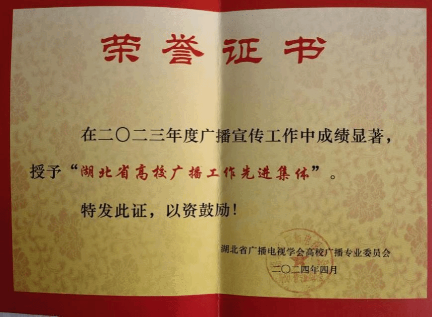 2024年全省高校广播工作会议由湖北省广播电视学会高校委员会召开,湖北省高校广播协会全体会员单位参与会议。会议通报了2022-2023年度湖北省高校广播节目评选结果,并颁发2023年度先进集体及个人奖状。其中,我校融媒体中心制作的节目《留声地带》荣获2022-2023年度”文艺类一等奖“,我校融媒体中心被授予2023年度“湖北省高校广播工作先进集体”。