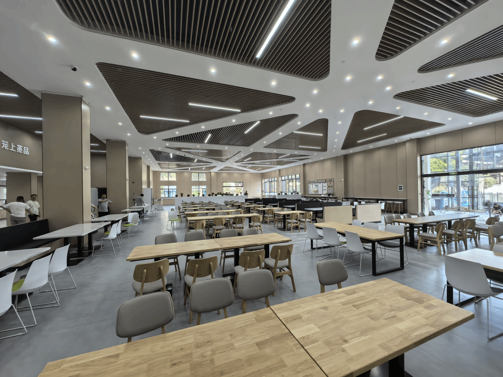 在装修设计上,春华餐厅注重室内环境的美化和校园整体风格的和谐美。全新的玻璃外墙不仅提升了校园整体环境的美感,也解决了雨雪天气露天楼梯湿滑不安全的问题。因地制宜增加的手扶电梯,安全实用美观。室内配备了现代化的空调系统,提供了良好的温控。餐厅一楼装饰风格现代简约,氛围温馨宜人,二楼采用简约工业风,契合学校办学特色,设计团队匠心独具,使这里成为师生们喜爱的用餐和交流空间。