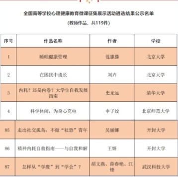 据悉,全国高等学校心理健康教育微课征集活动旨在提升高校学生心理健康教育质效,强化心理健康数字资源建设,此次征集活动共收到来自全国414所高校的1195件作品,其中,119件教师作品和50件学生作品入选。经评审遴选出的心理微课将在中国大学生在线等网络平台进行展播,为广大师生提供宝贵的学习资源,进一步促进心理健康知识的普及与应用。