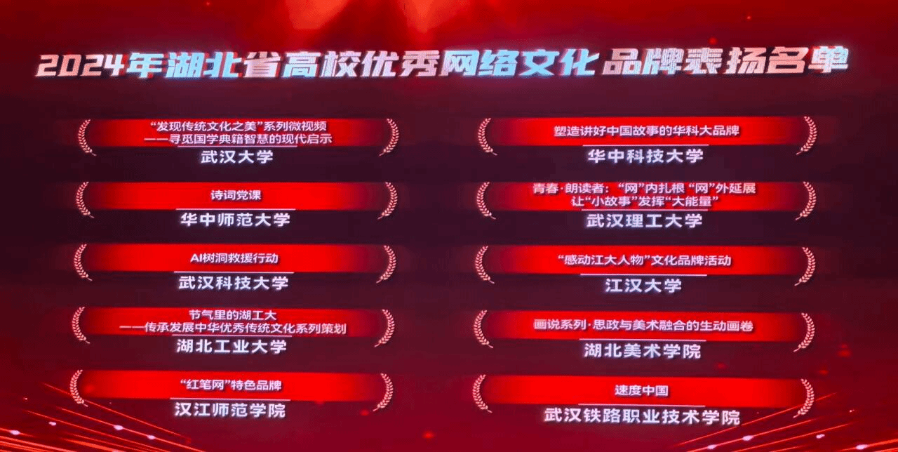 武科大网讯(通讯员 方钟明)12月10日,由湖北省委宣传部(省文明办)指导,省委网信办、团省委、省教育厅主办,华中科技大学承办的主题为“网聚长江文明力量 绽放荆楚文化风采”2024年湖北省高校优秀网络文化成果集中宣传展示活动举行。我校计算机科学与技术学院选送的网络文化品牌项目“AI树洞救援行动”上榜湖北省高校优秀网络文化品牌表扬名单,学校作为表现突出工作单位受到表扬。