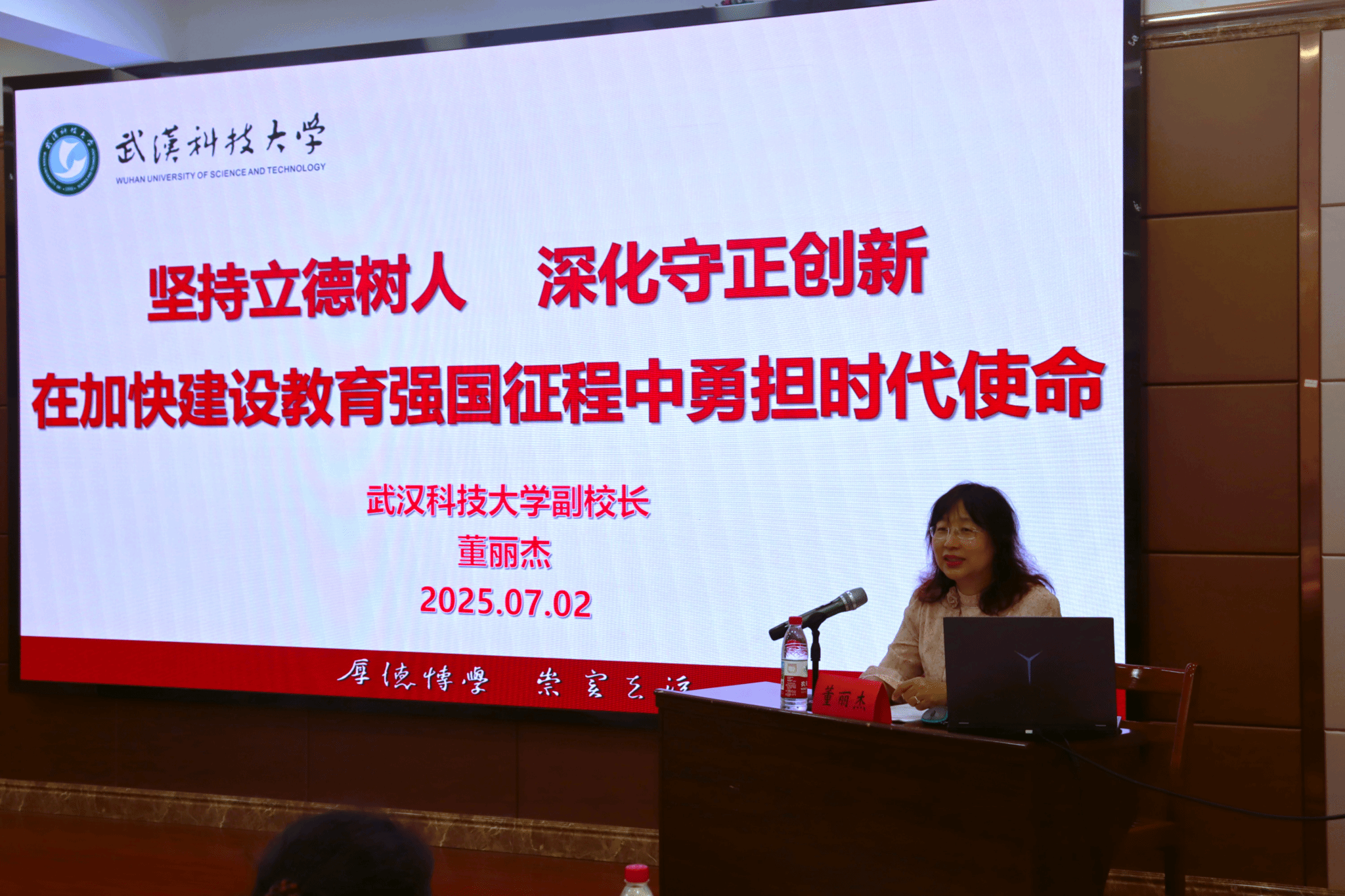 武科大网讯(通讯员李子怡) 7月2日上午,副校长董丽杰在黄家湖校区教七楼70308报告厅为化学与化工学院师生讲授题为“坚持立德树人,深化守正创新——在加快建设教育强国征程中勇担时代使命”的主题思政课。学院党委书记刘抗强、副书记余婷以及教师、学生代表110余人参加,刘抗强主持活动。