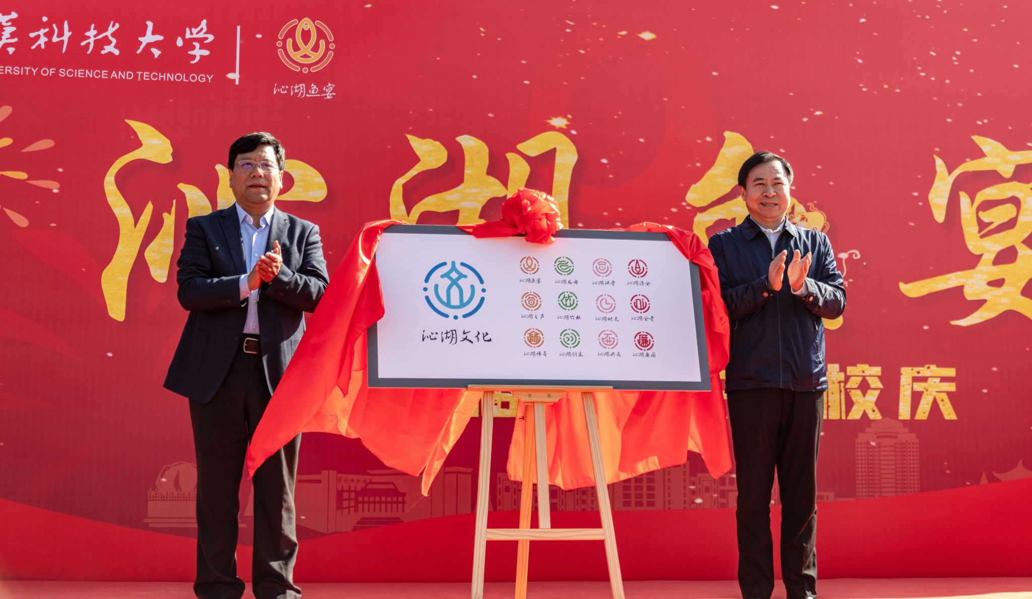 党委副书记孙国胜、副校长沈季伟公布沁湖文化标识 杨佳伟摄