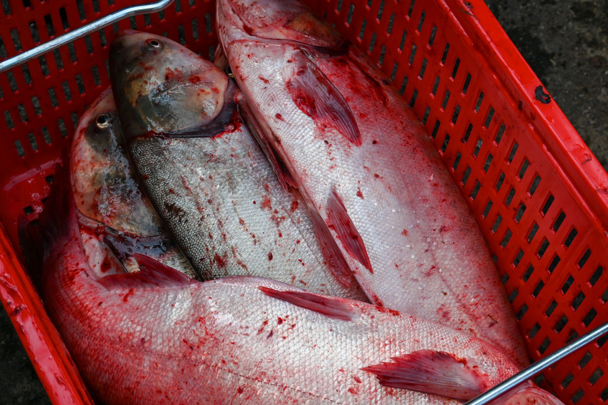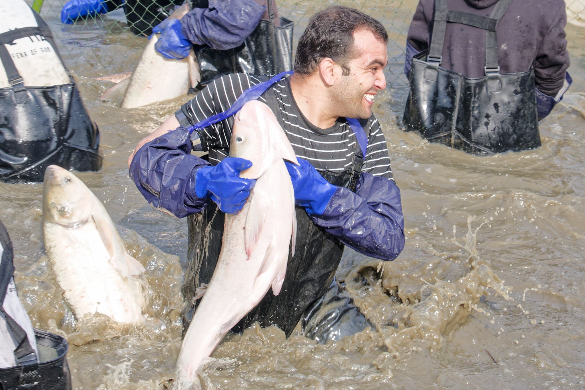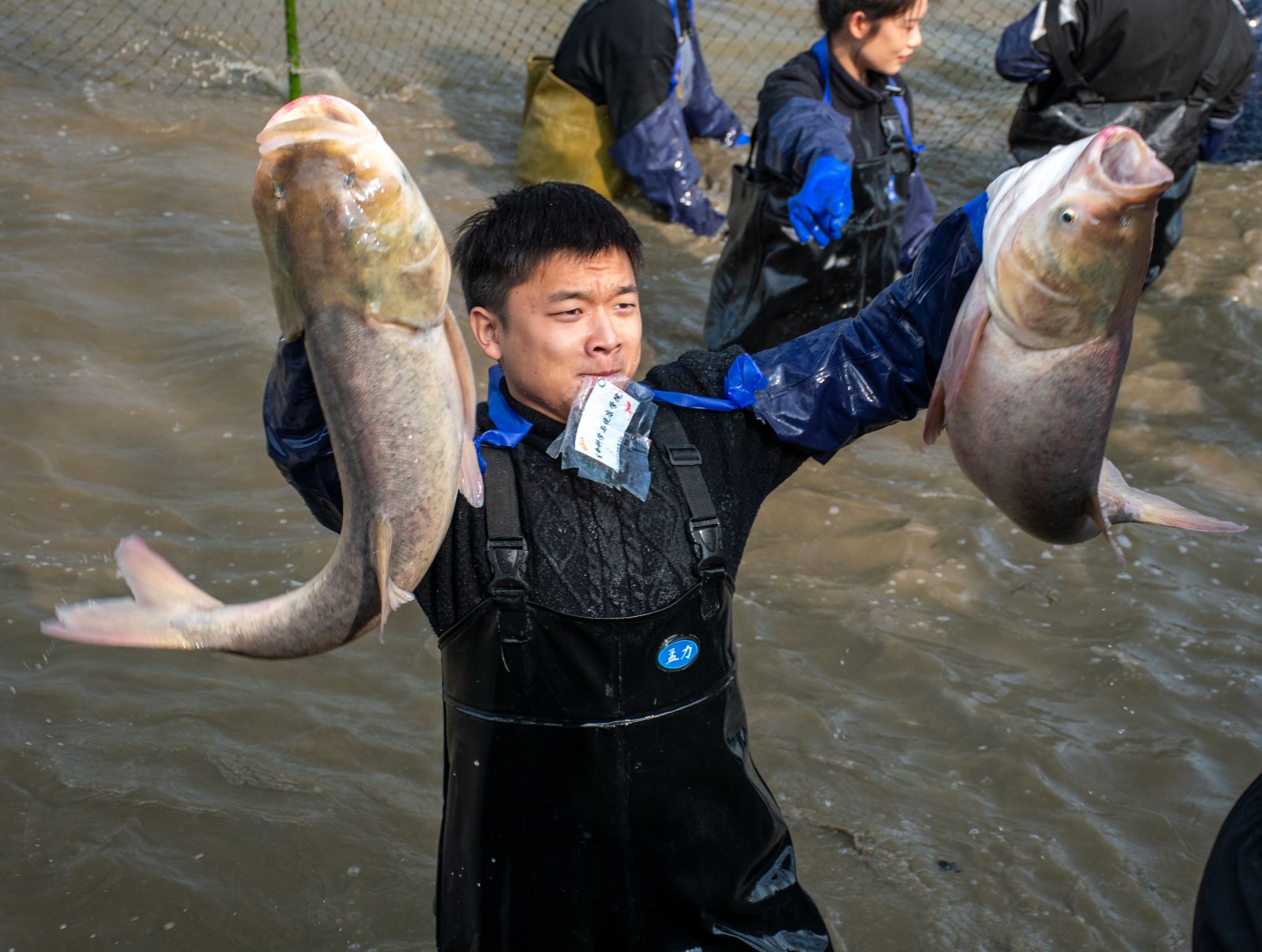 拉鱼后勤爷爷与跃出的鱼特写 陈楷林摄