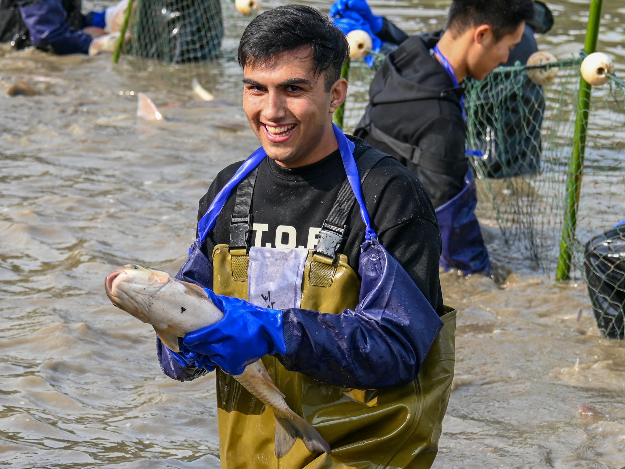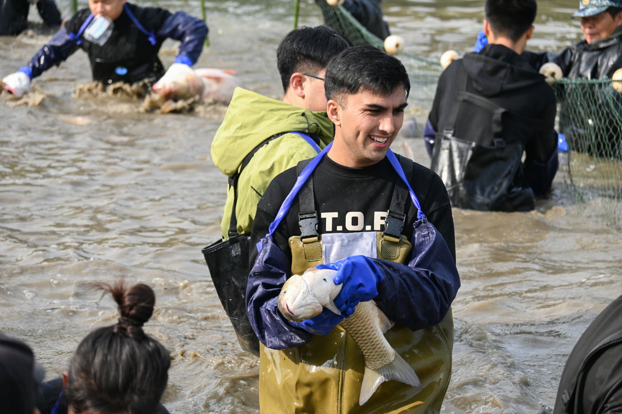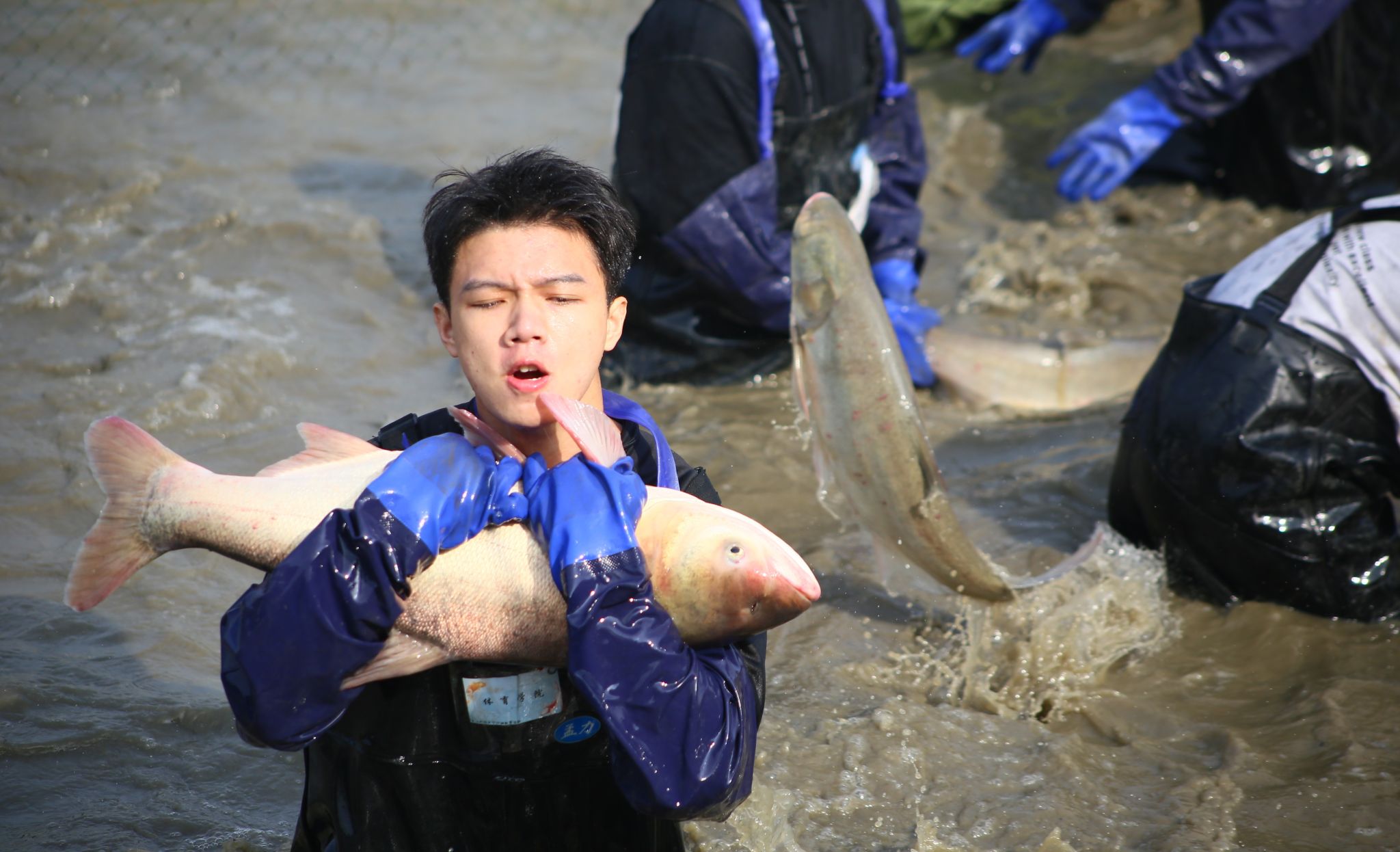 11月21日上午8时,学校近百名中外师生和后勤集团员工身着统一的红色服装,在沁湖边拉开了捕鱼活动的序幕。经过半个多小时的激烈争夺,信息学院徐润收获了一条20.5斤重的大鱼,获得了今年的“捕鱼王”称号。