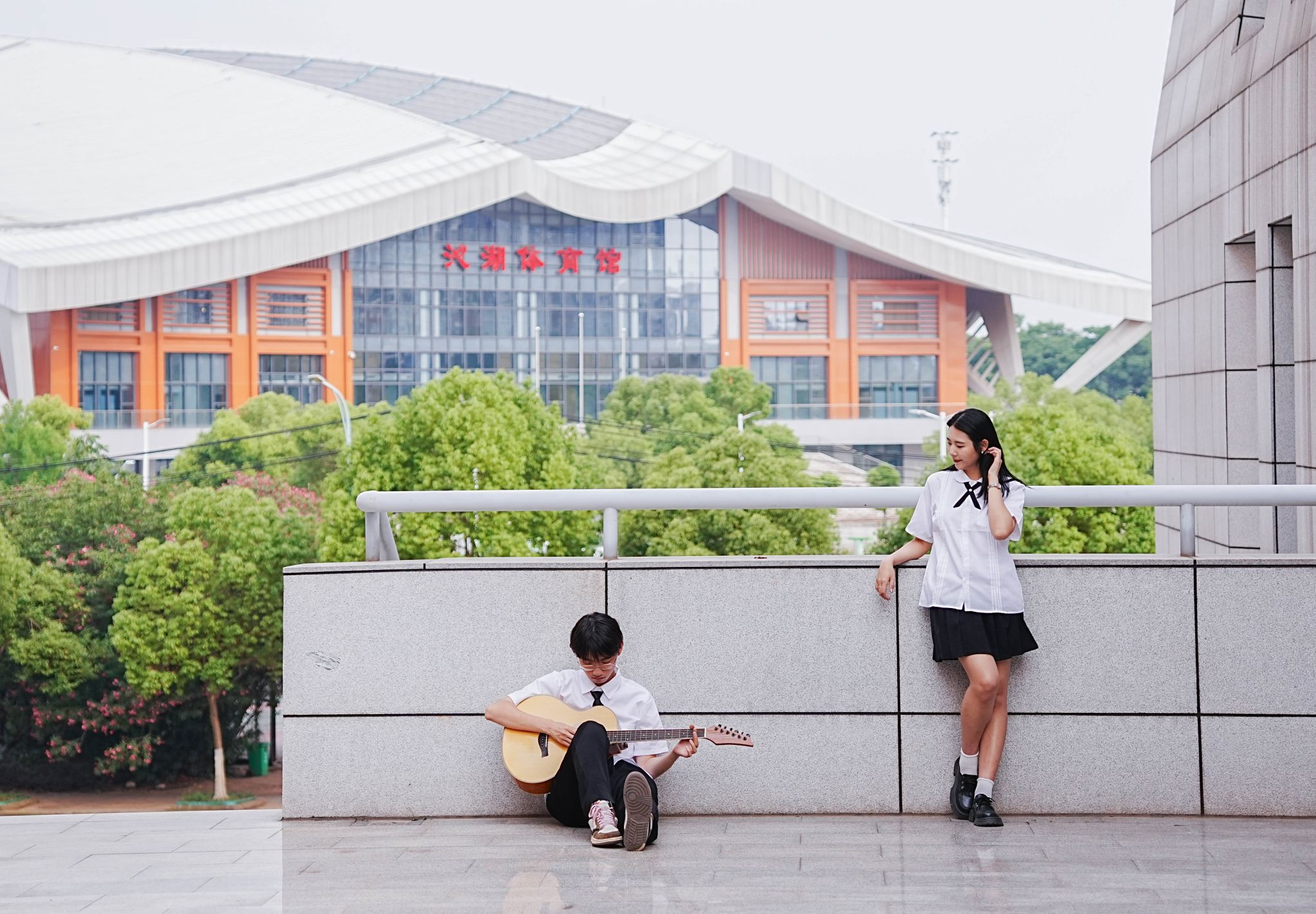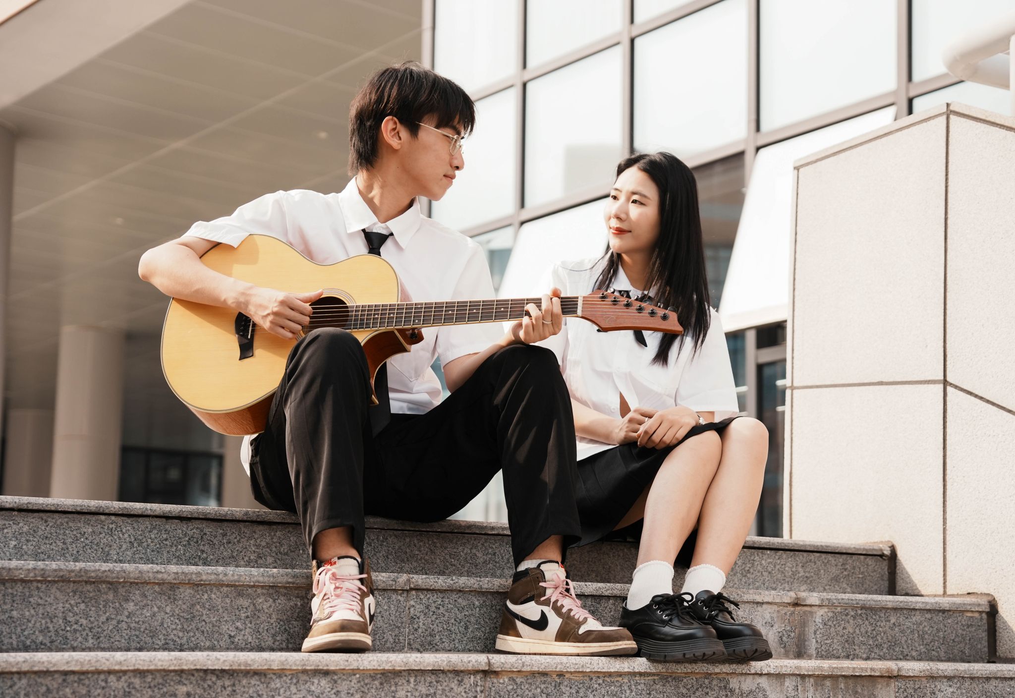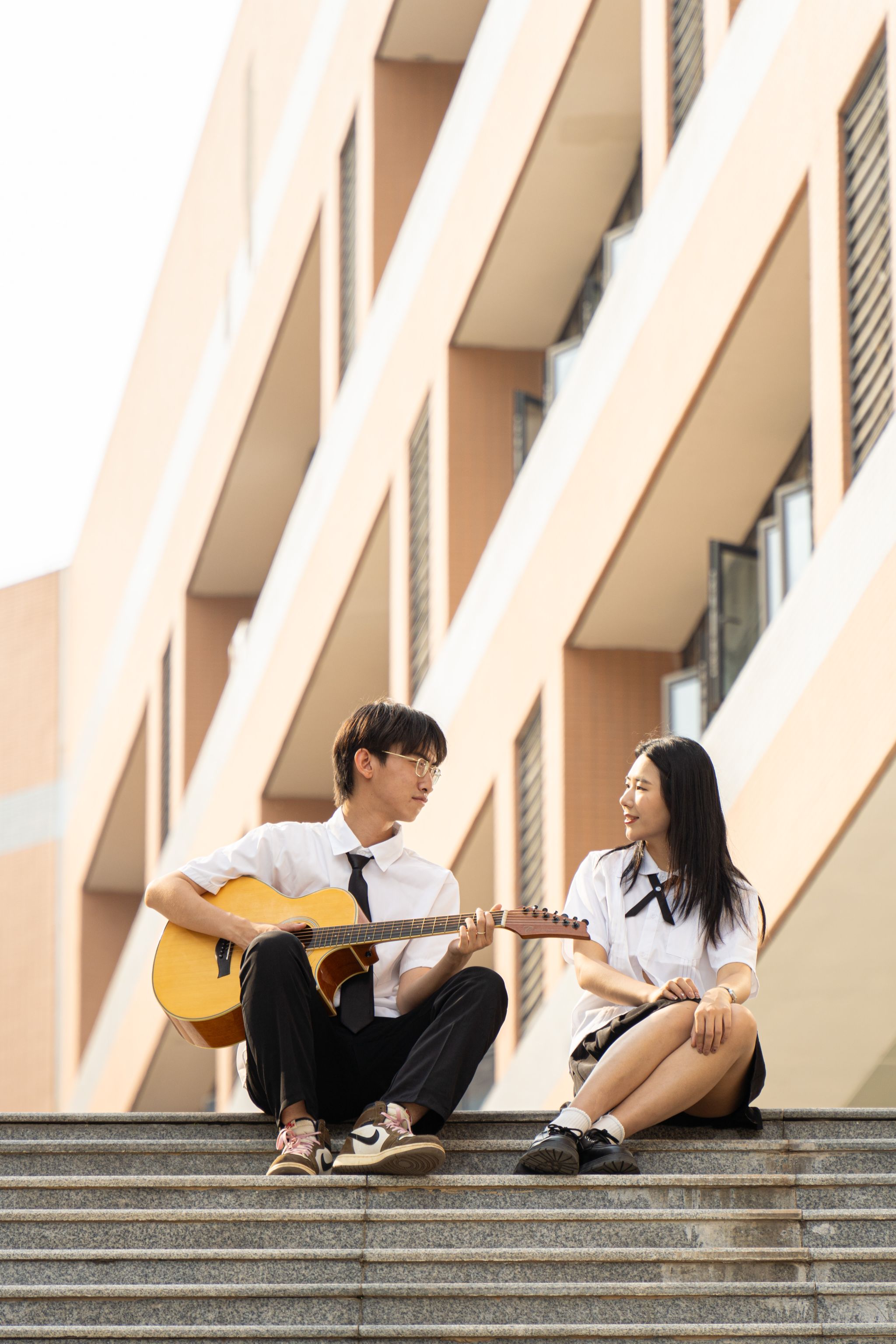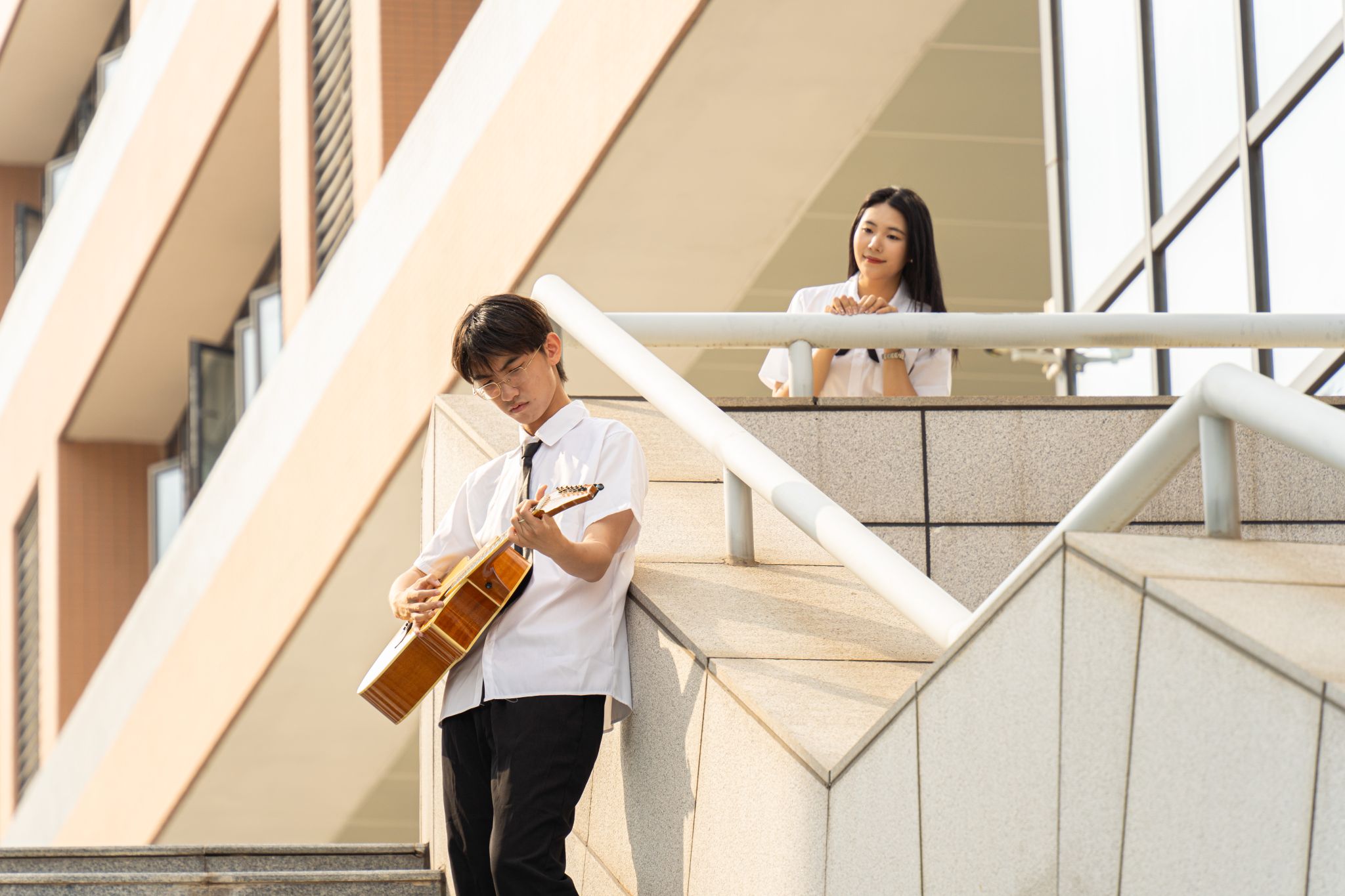 男女生在阶梯上弹吉他 张贝贝摄