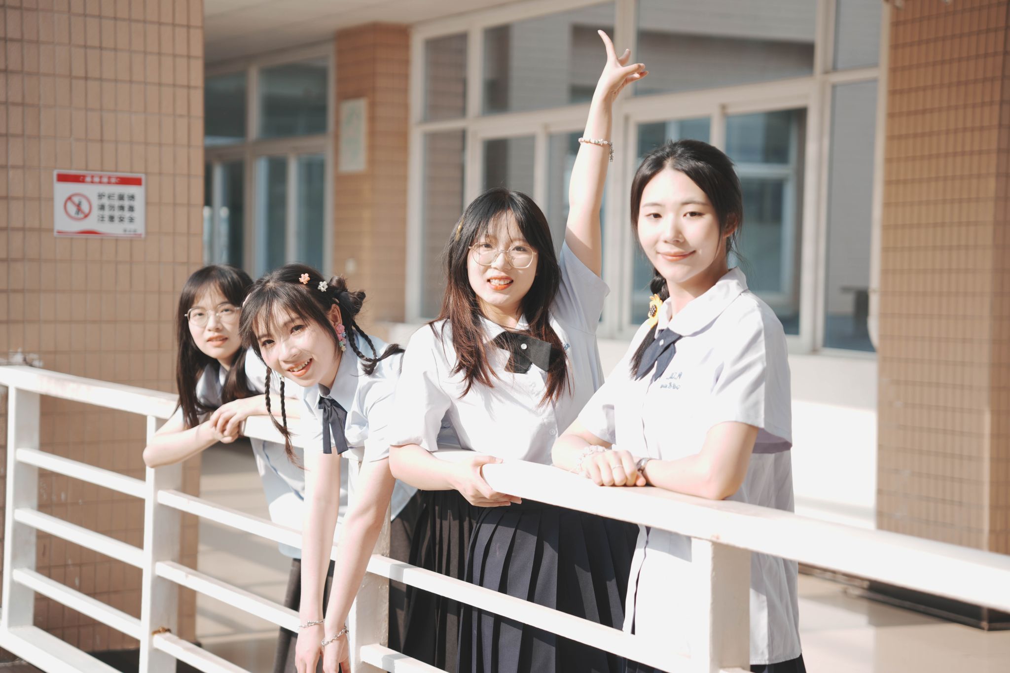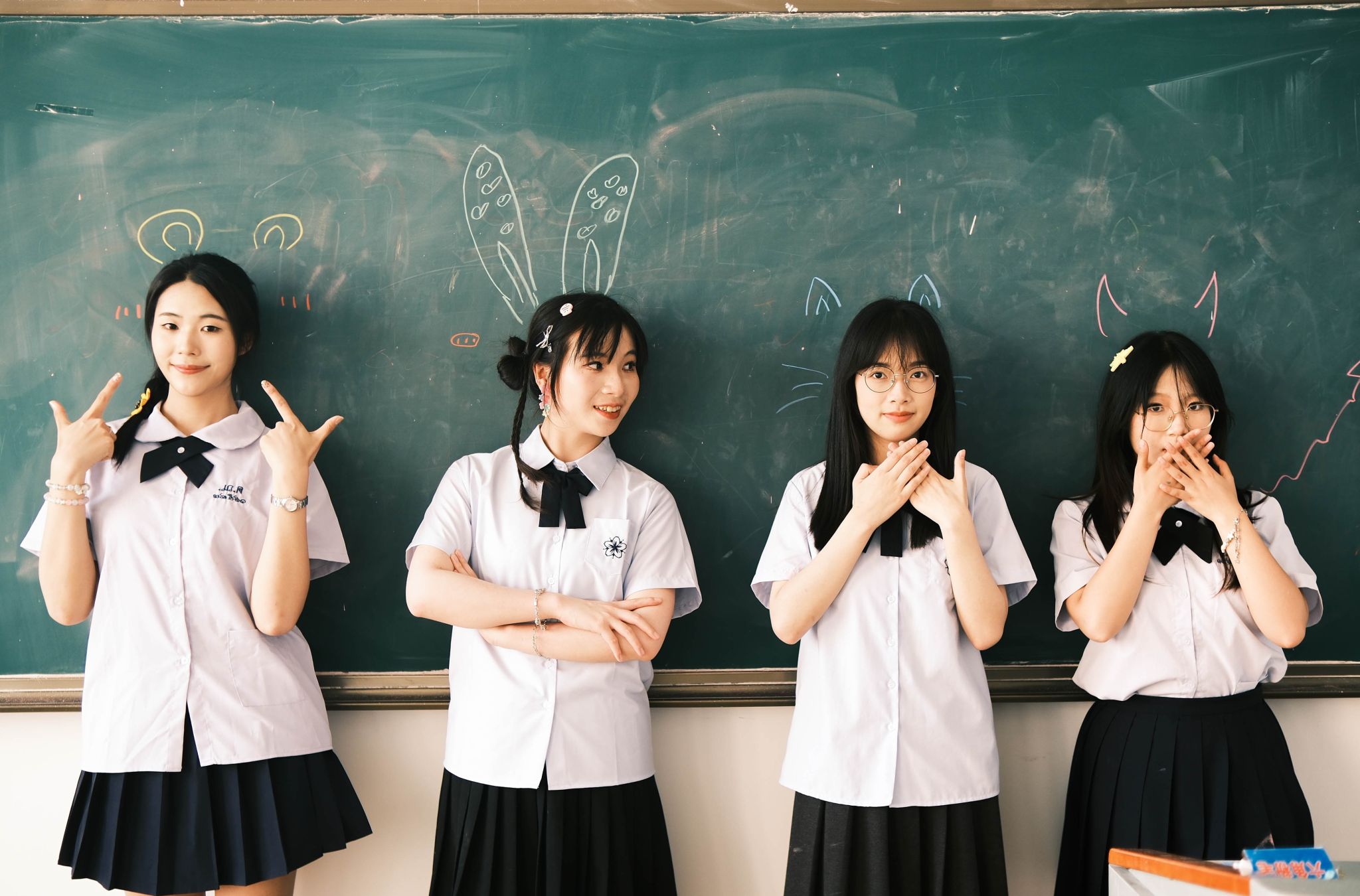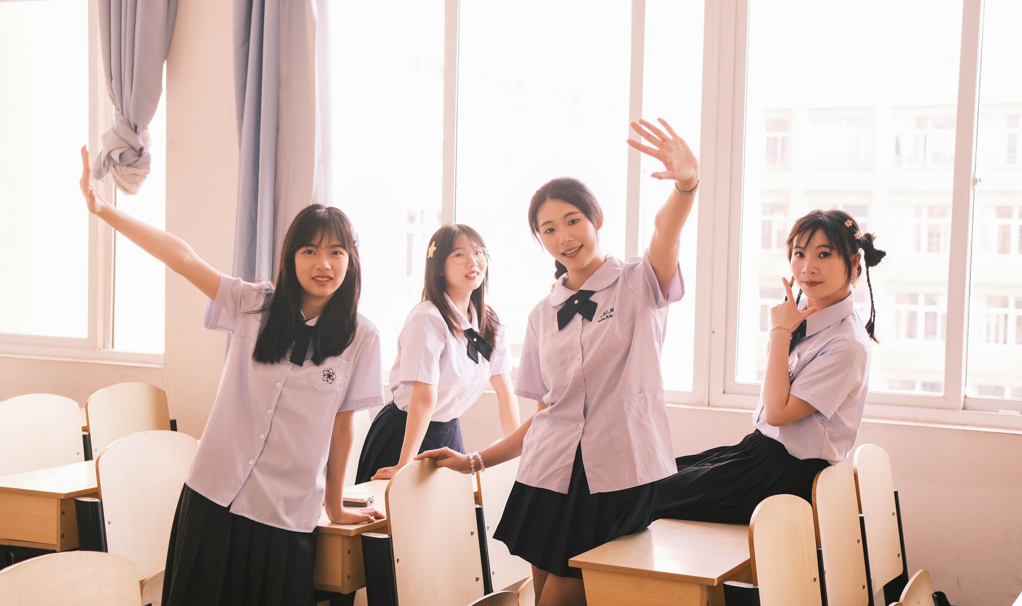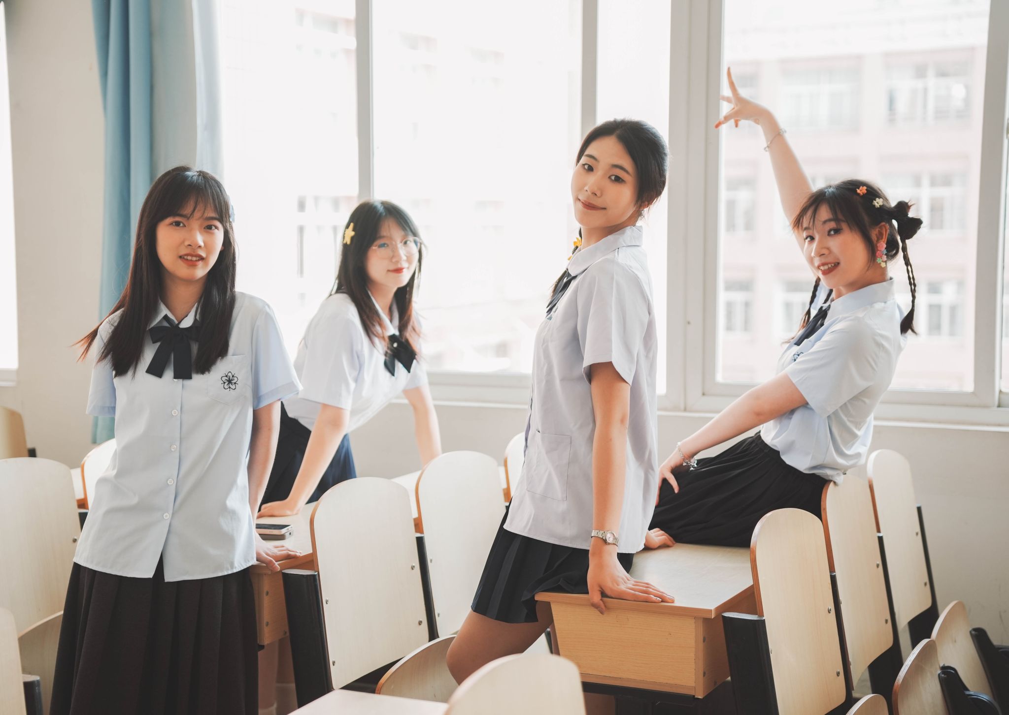 教室坐桌子上合照 陈薏帆摄