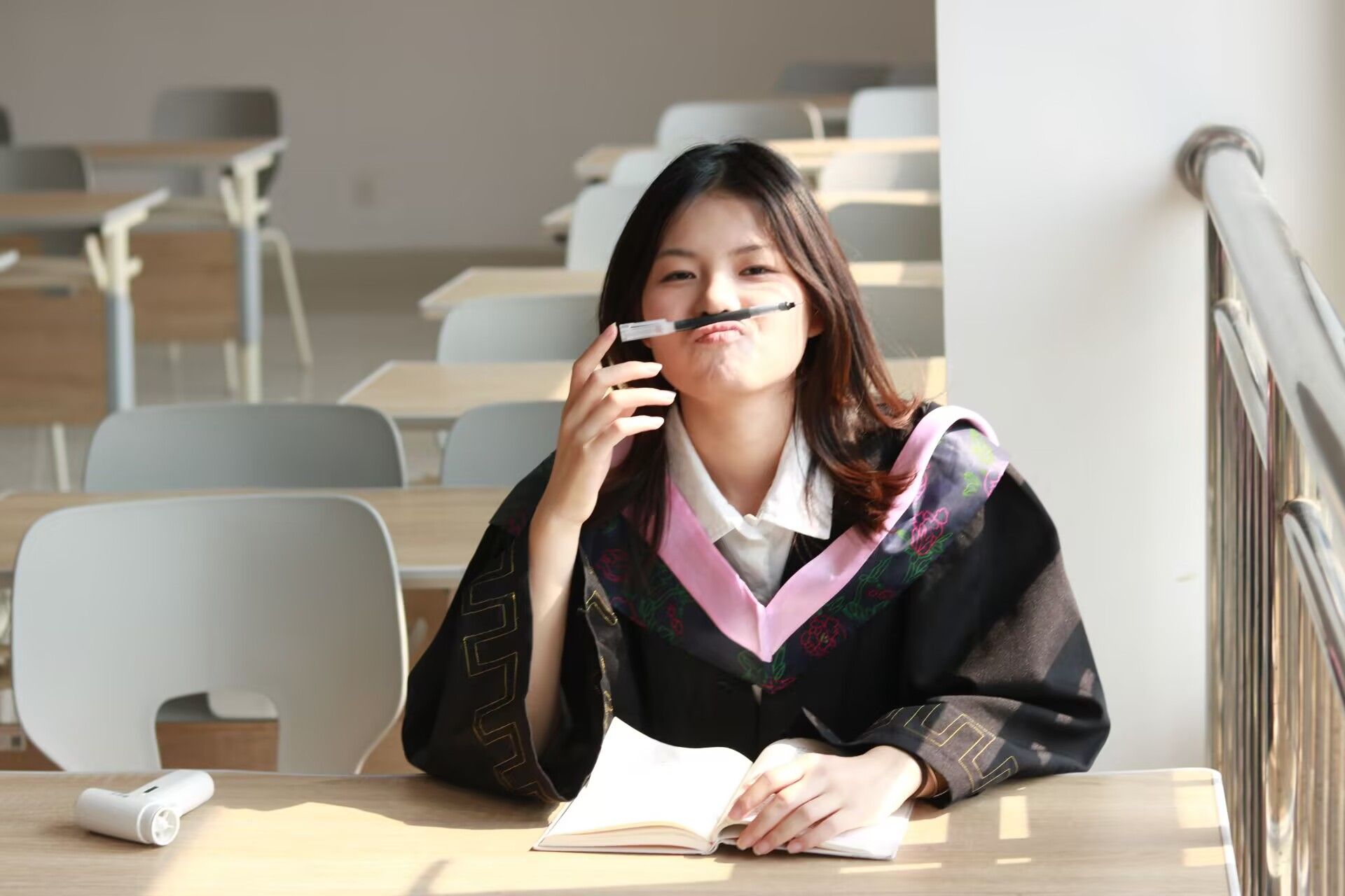 在教室座位上比心 张贝贝摄