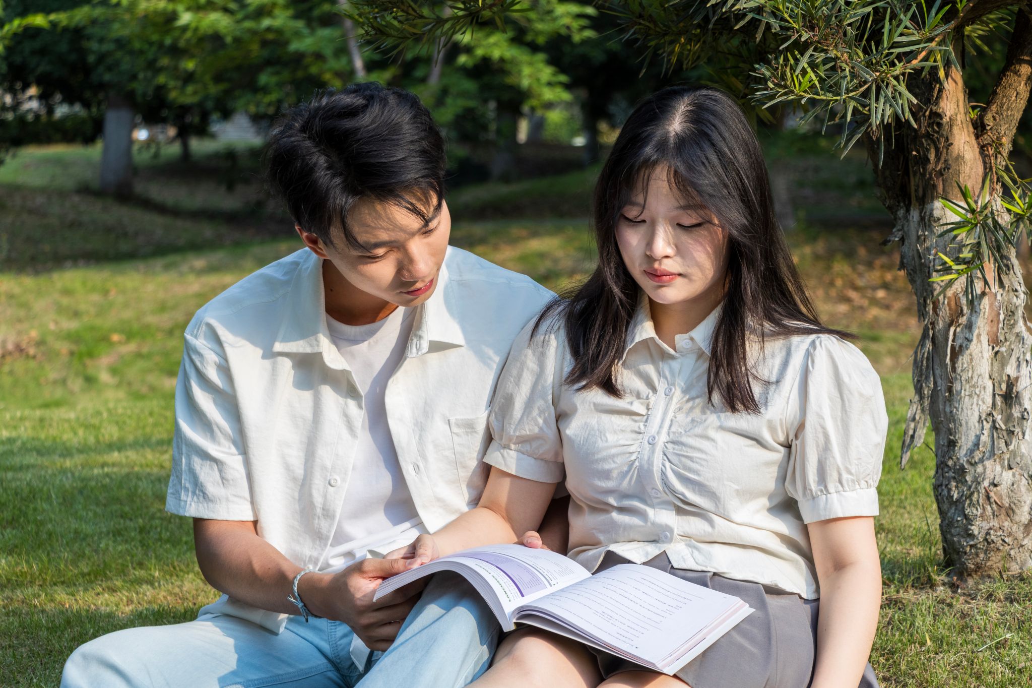 方泽国和他的对象在草坪上看书 唐治海摄