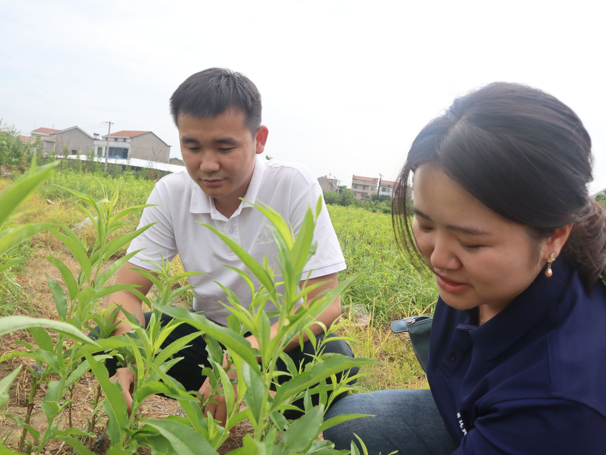 实践团指导老师赵亚宾周家欣考察桃树苗生长情况 程雨博摄