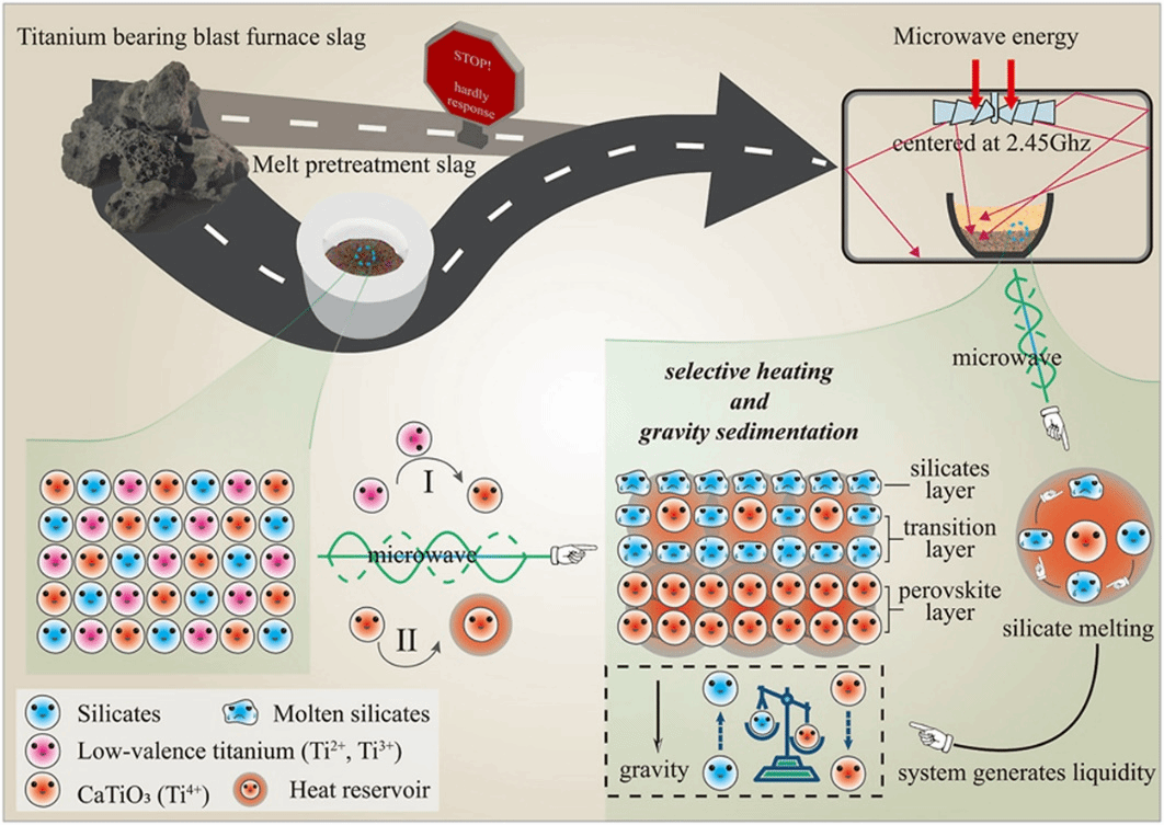 钛及其合金材料具有优良性能,用途广泛,被誉为全能金属。典型固体废弃物含钛高炉渣中含有的钛资源占世界钛储量的50%以上,然而,目前有效利用率不足3%,且现有工艺存在流程复杂、污染严重、成本高等诸多不足,严重影响了钛资源的提取利用。针对这一现状,该研究团队以含钛高炉渣的工艺矿物学研究为基础,详细分析了物化反应过程中各组分性能差异及变化规律,通过计算模拟首次提出按组分提取的新思路。首创的熔融预处理-微波加热技术,实现了含钛组分的物相可控转变和定向迁移,并可获得钙钛矿品位82%、钛回收率84%的优异技术指标,其产品的低带隙(2.25eV)为应用提供了广阔空间。该技术具有流程简单、无污染、产品质量高的特点,为含钛高炉渣的高效利用提供了新方案。