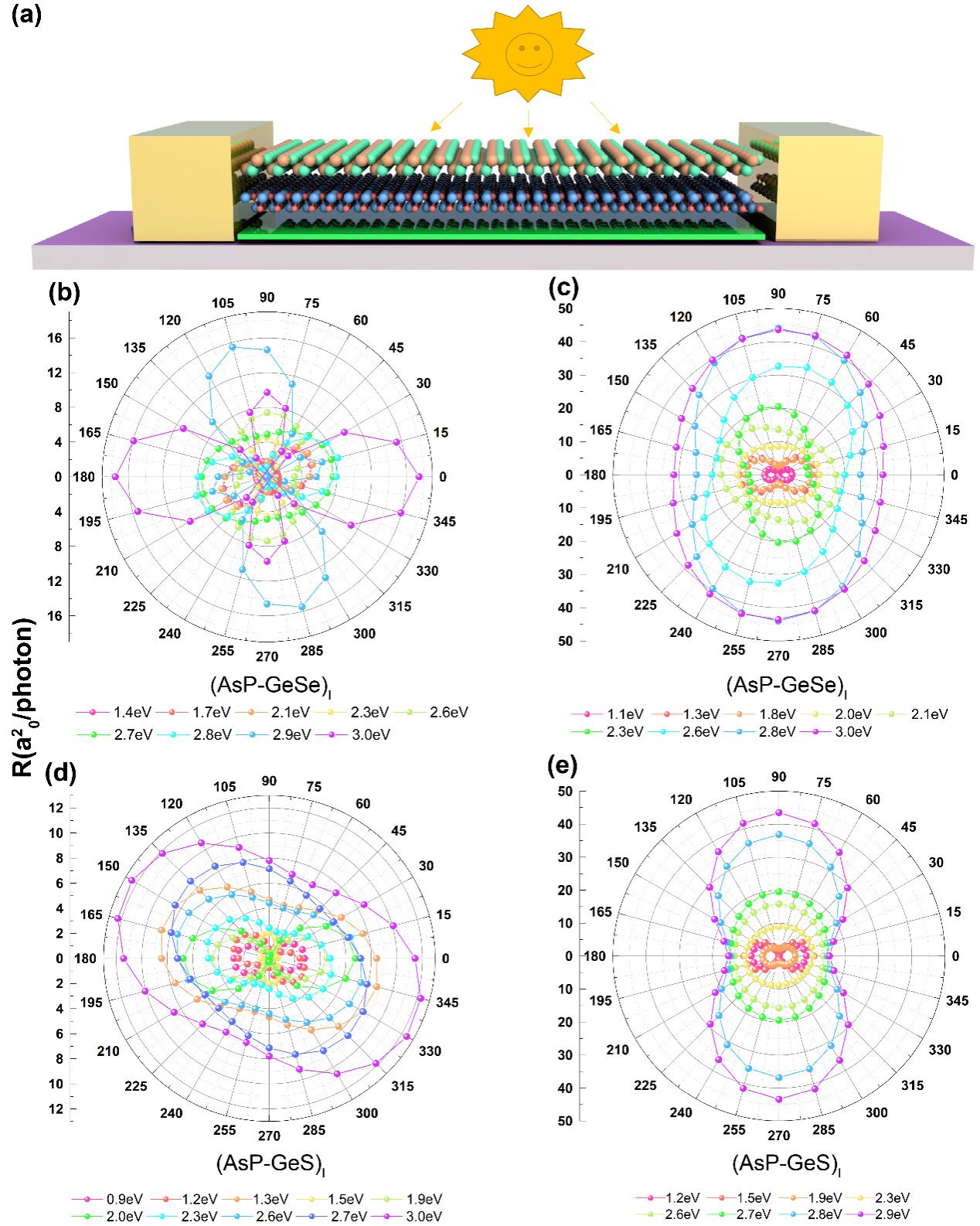 为了研究这种异质结的可应用性,朱思聪团队进一步考虑将其设计作为光电探测器。基于异质结的光子器件表现出更强的偏振各向异性,(AsP−GeS)I异质结保持了良好的控制偏振稳定性,与光子能量无关(图一)。此外,这些器件显示出宽带响应和高偏振灵敏度,超过了单一组分。(AsP−GeSe)V异质结分别表现出1137 nm和2076 nm宽带高响应和强偏振灵敏性。这些结果揭示了双异质结工程策略可以调控材料电子结构以实现高效光子纳米器件。(理学院)