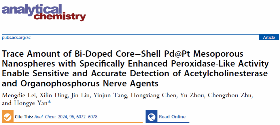 武科大网讯 近日,我校化学与化工学院青年教师严红烨与华中师范大学朱成周教授团队合作在《Analytical Chemistry》期刊上发表题为“Trace Amount of Bi-Doped Core–Shell Pd@Pt Mesoporous Nanospheres with Specifically Enhanced Peroxidase-Like Activity Enable Sensitive and Accurate Detection of Acetylcholinesterase and Organophosphorus Nerve Agents”的研究论文。学生雷梦蝶为第一作者,严红烨为通讯作者,化学与化工学院、煤转化与新型炭材料湖北省重点实验室为论文第一单位。