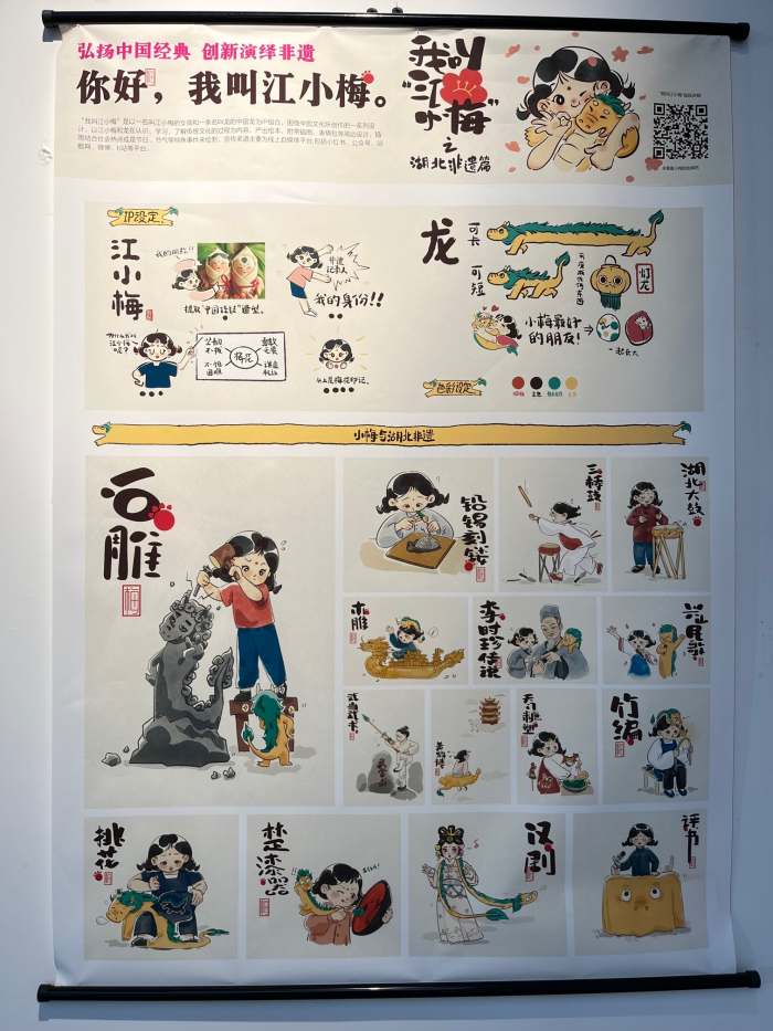 潮玩展上,一组名叫《你好,我叫江小梅》的作品收到了师生们的点赞:“湖北非遗这组漫画太生动了!”“我想用江小梅的表情包!”“江小梅的周边好精致。”……据作者该校艺术学院大三学生江楠解释,她以“弘扬中国经典,创新演绎非遗”为创作理念,以“中国娃娃”为灵感,设计出“江小梅”这一IP形象与中国龙结合的IP形象。