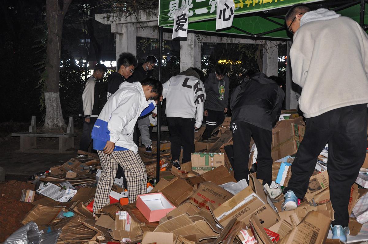 绿联社志愿者压平纸板(通讯员杨天羿摄 )