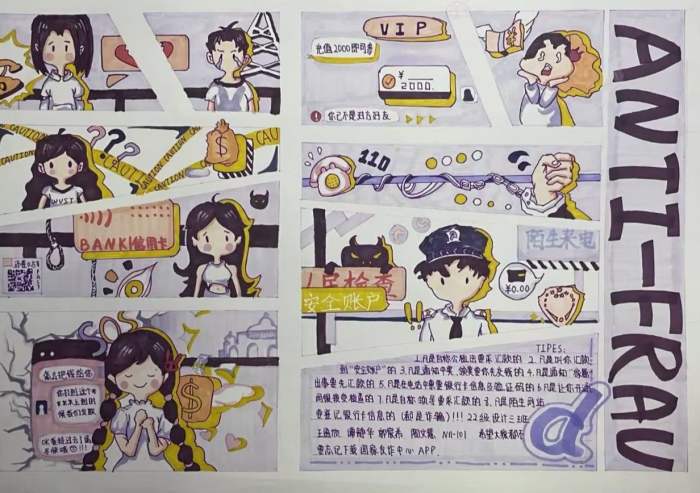 马克笔绘制的“国家反诈中心APP”彩色漫画、针管笔绘制的“八个凡是”黑白漫画、用平板绘画绘制的诈骗连环漫画……新生们以多种风格的漫画来宣传反诈骗知识。