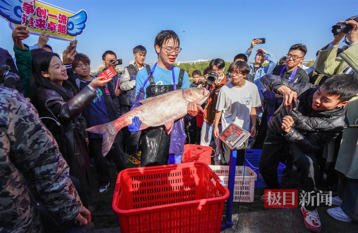“大家加把劲,争取多捞一点,让每一位武科大人都吃上自家湖里的鱼!”上午8时许,随着一声“收网”,该校近百名师生开始在沁湖边拉纤,合力拉渔网,将其收拢至岸边。九时收网,一条条大鱼活蹦乱跳,16名身穿捕鱼套装的学生随即下水捕鱼。经过半小时的比拼,资源与环境工程学院学生张鑫捕了一条30.2斤重的大鱼,获得了今年的“捕鱼王”称号。他举着大鱼激动地说:“今年我要为学校125周年校庆献上这条最重的大鱼!”