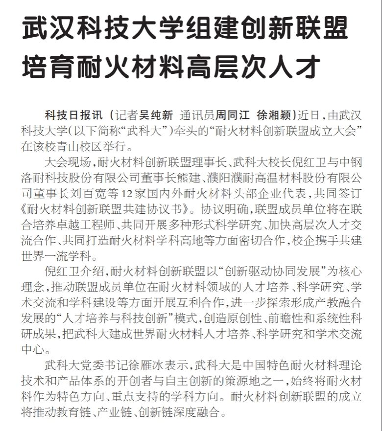 武科大党委书记徐雁冰表示,武科大是中国特色耐火材料理论技术和产品体系的开创者与自主创新的策源地之一,始终将耐火材料作为特色方向、重点支持的学科方向。耐火材料创新联盟的成立将推动教育链、产业链、创新链深度融合。