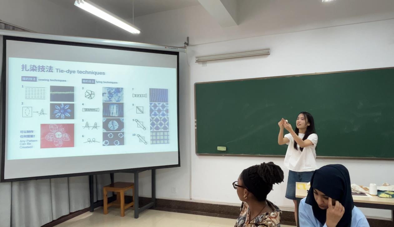 本次活动的核心体验项目,源自艺术与设计学院聂虹教授《传统文化与民间艺术实践》课程的成果转化。面对非遗技艺在普及传播中的挑战——武强木版年画套色繁复、植物扎染工艺参数难控、板鹞风筝工序冗杂,师生团队迎难而上:优化木版刻制流程,实现图案精简化与色彩标准化;通过大量实验,确立扎染染色参数与布料处理规范;改良风筝竹条处理与骨架组装工艺。经反复打磨,成功将精深技艺转化为适合国际学生体验的互动项目,为沉浸式文化课堂奠定了坚实基础。