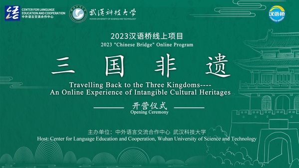 武科大网讯(见习记者姜泊远 记者金红志艺)2月8日下午,由中外语言交流合作中心主办,我校承办的“汉语桥”线上项目——“三国非遗”开营。来自越南、巴基斯坦、日本、埃塞俄比亚、孟加拉国、加纳、新西兰等13个国家的255位学生将在未来12天内通过直播和录播的形式学习三国历史知识,体验我国非遗文化。
