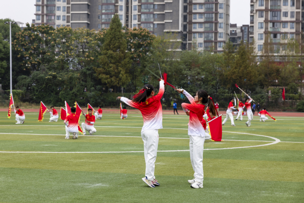 手握长棍、长剑,挥舞旗帜的武术方阵动作苍劲有力。随着激昂的音乐,学生们迅速摆成一个大圆,火焰边纹的旗帜在绿茵场上飞舞,旗帜猎猎作响。“这既代表着星星之火可以燎原,也是团结的象征,同时也寄托了让我们学校办得越来越好,办的越来越有特色的希望。”带队老师赵茜介绍道。