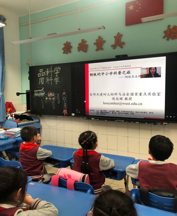 在今年5月的科技周中,武汉小学师生观看了实验室侯延辉教授录制的《钢铁的故事》科普微课。在微课中,我校老师通过丰富的图片、视频展示,形象、直观、系统地讲解了钢铁冶炼的科普知识,讲解通俗易懂,贴近生活实际,具有极强的示范指导作用,为小学生们上了一堂生动、精彩的科普课。通过科普微课的学习,使孩子们在了解钢铁冶炼知识的同时,也学习到了坚持不懈、持之以恒的精神,立志未来能够成为真正的“钢铁英雄”。