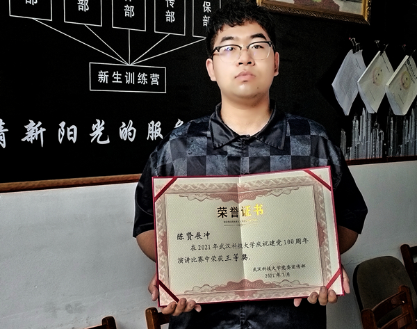 在今年五四青年节到来之际,陈贤展冲作为我校青年讲师团的成员,前往襄阳市庞工街道杨家河村,在田间地头为农民讲述党的百年征程中重大历史事件。“讲得太好了,还是这些大学生娃娃讲得明白。听了这些感人的故事,我们就好像看到了美好的明天,更有动力在党的领导下创造幸福的新生活了。”当地一位老农感叹道。
