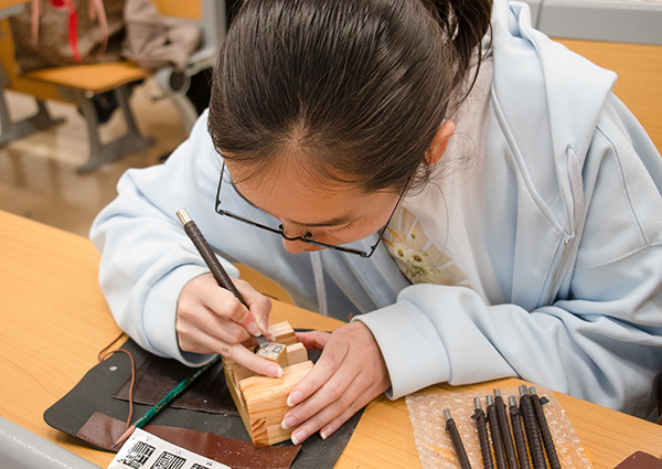 本就喜爱书法的学生周昕怡兴致勃勃,主动上前体验篆刻流程。刘忠示范过后,周昕怡用篆书字体在纸上写下了“中文”二字,再用刻刀一刀一划地将汉字雕刻在砂纸打磨加工后的印石上。为完美呈现效果,刘忠继续对印章进行一一修改、打磨。“如果你刮掉了字体的部分,那么印章印出来的就是镂空的字样;如果你刮掉了空白部分,那么印章印出来的就是字体本身。”刘忠鼓励着学生尝试新玩法。