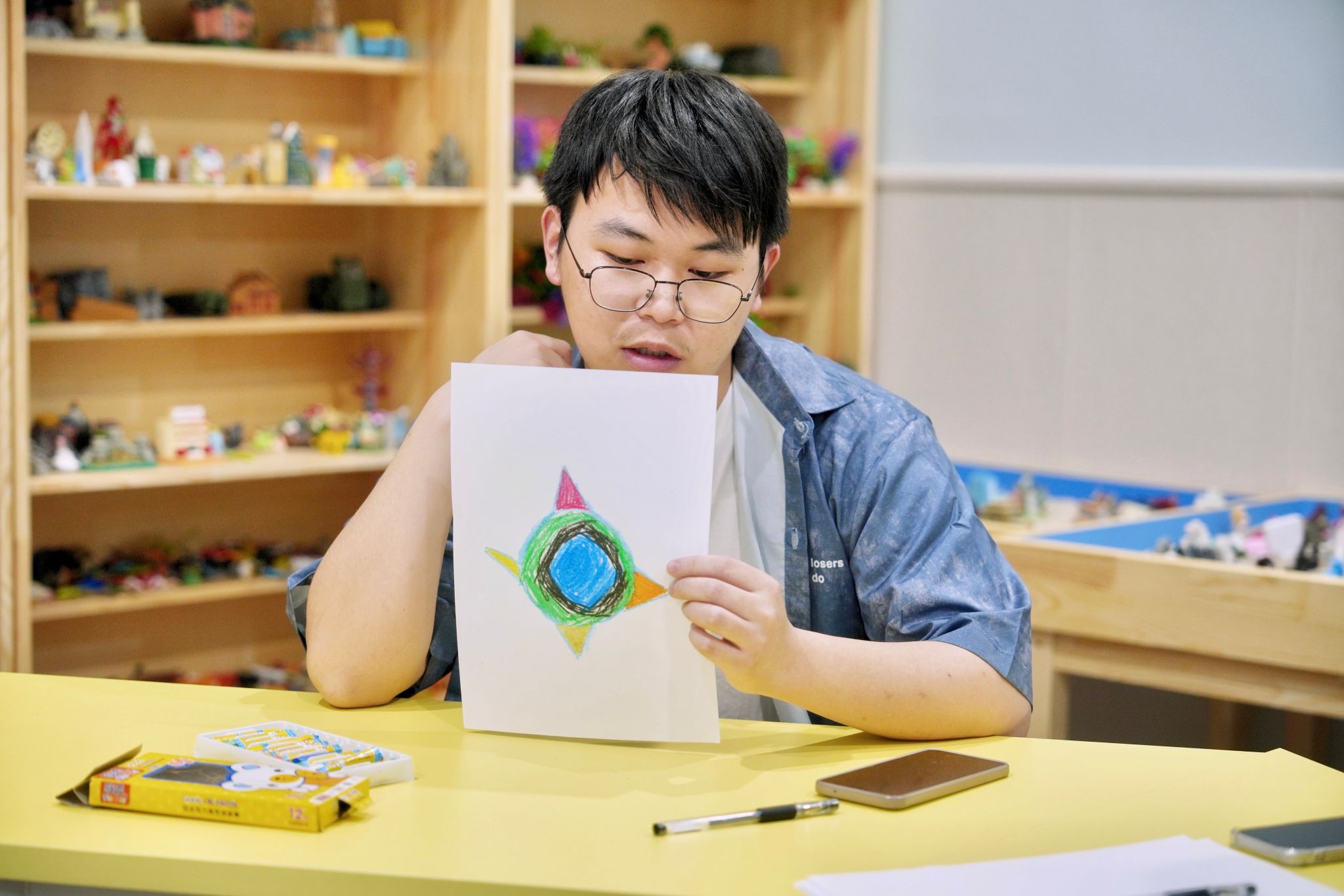 在五分钟的呼吸冥想放松后,陈佳为学生们分发了白纸与蜡笔,让同学们在纸上画出此刻心中的自画像。“自画像既可以是人物,也可以是一些色块。大家思考画中元素与自己的关联,而后依托自画像来面向大家进行自我介绍。”陈佳提示道。